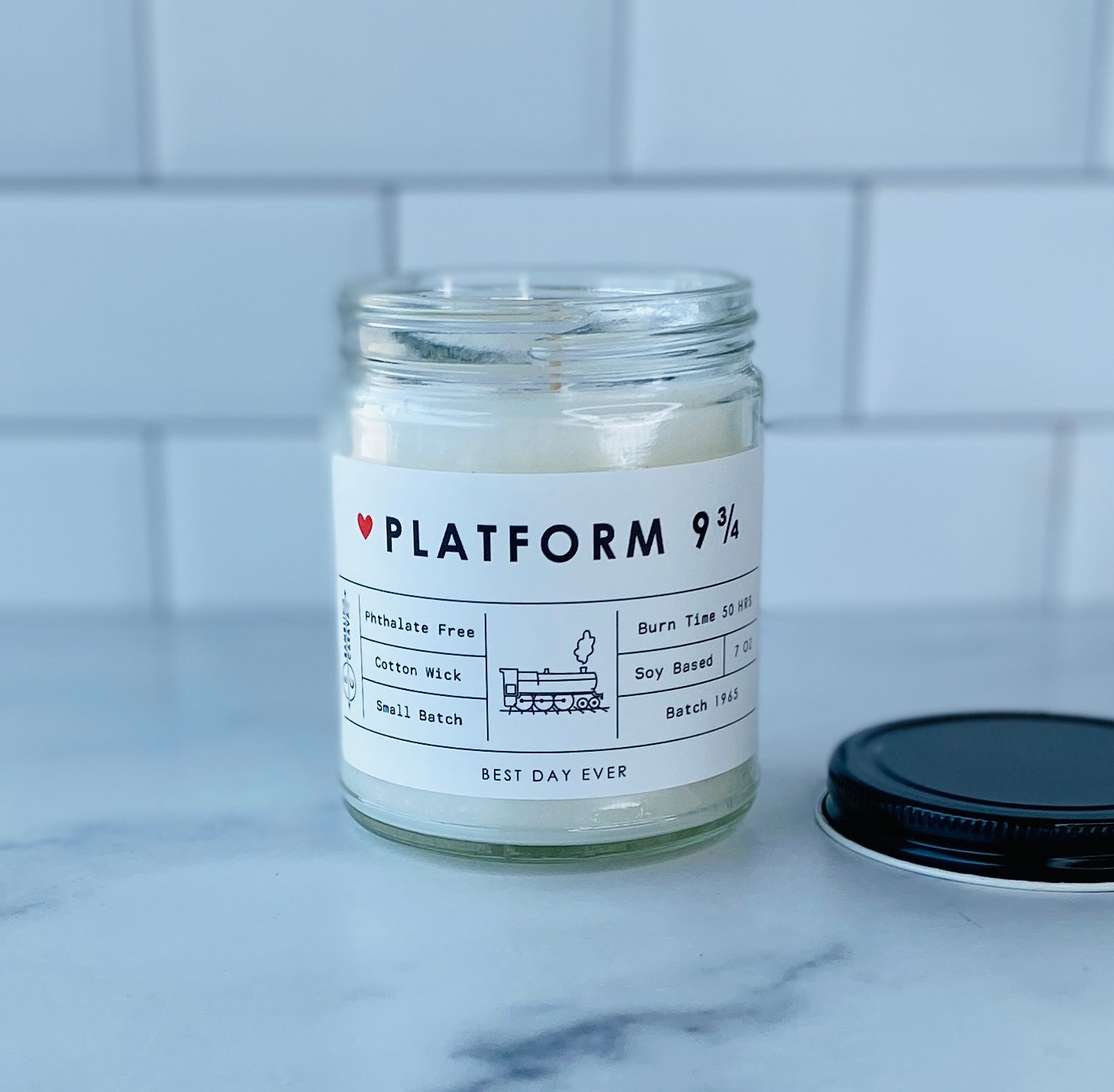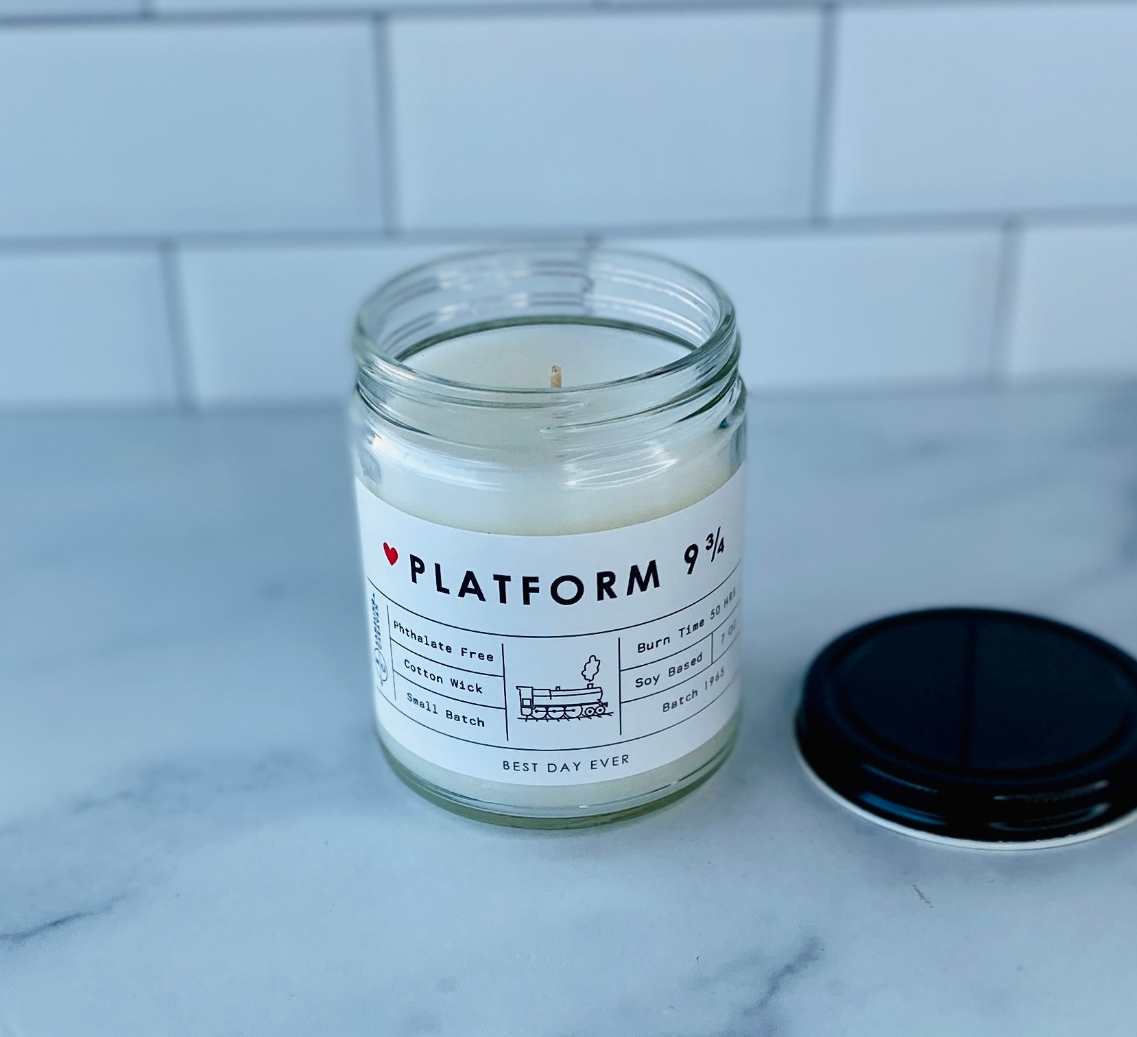 Platform 9 3/4 Candle - Rambling Caravan candles are inspired by home, travel and adventure. Made from a soy/coconut based wax blend, the candles are hand poured in Virginia Beach, Virginia. We use phthalate free fragrances and have an assortment of fragrances from which to choose. Many of our candles have different color labels to choose from as well. We use cotton wicks with no zinc or lead. We do not use additives, nor scent enhancers or UV blockers. The burn time is approximately 50 hours.