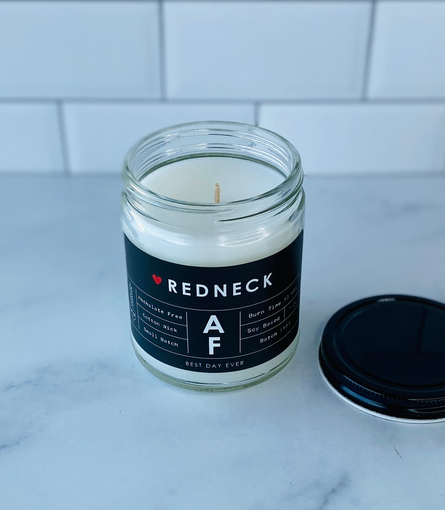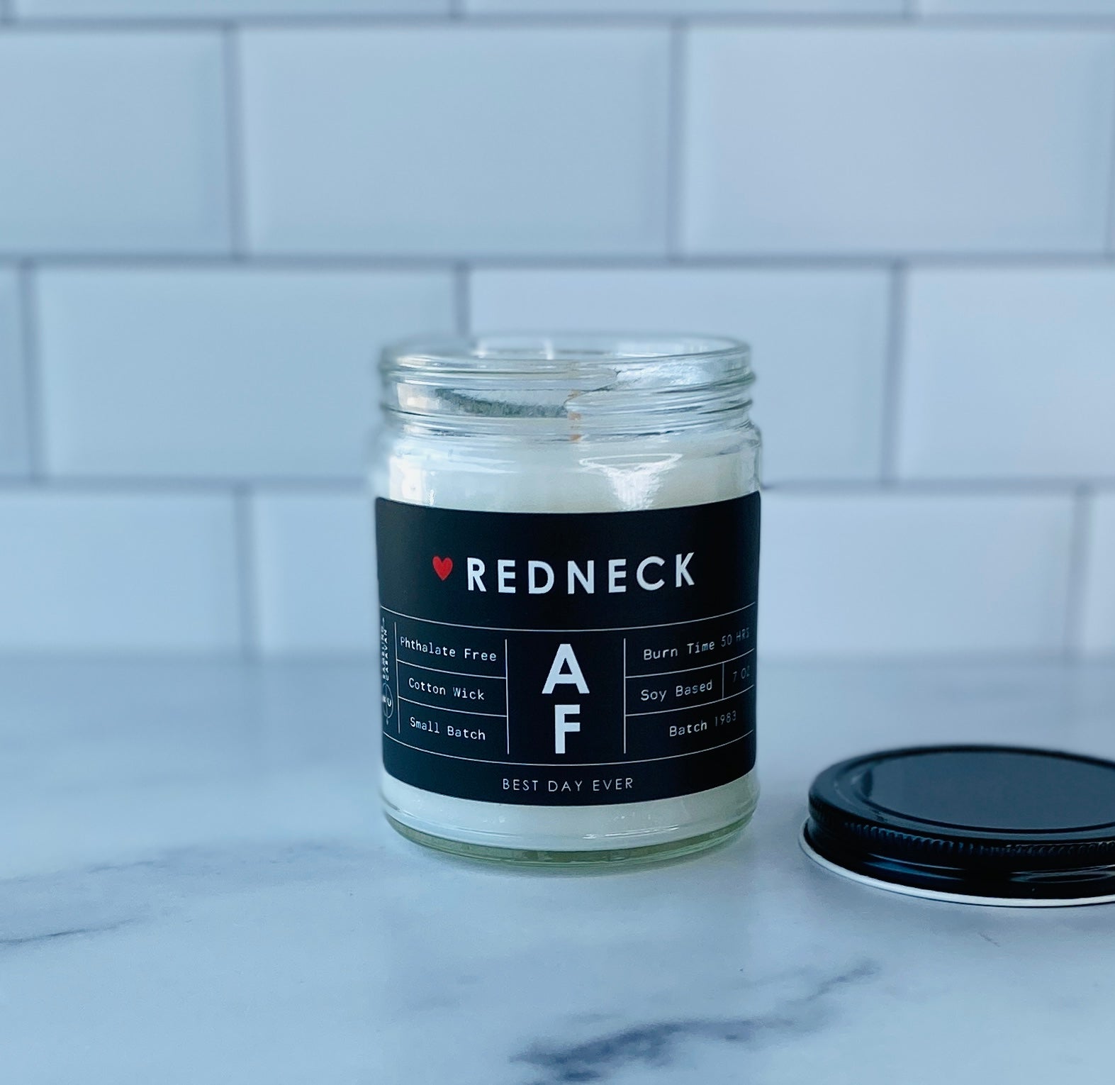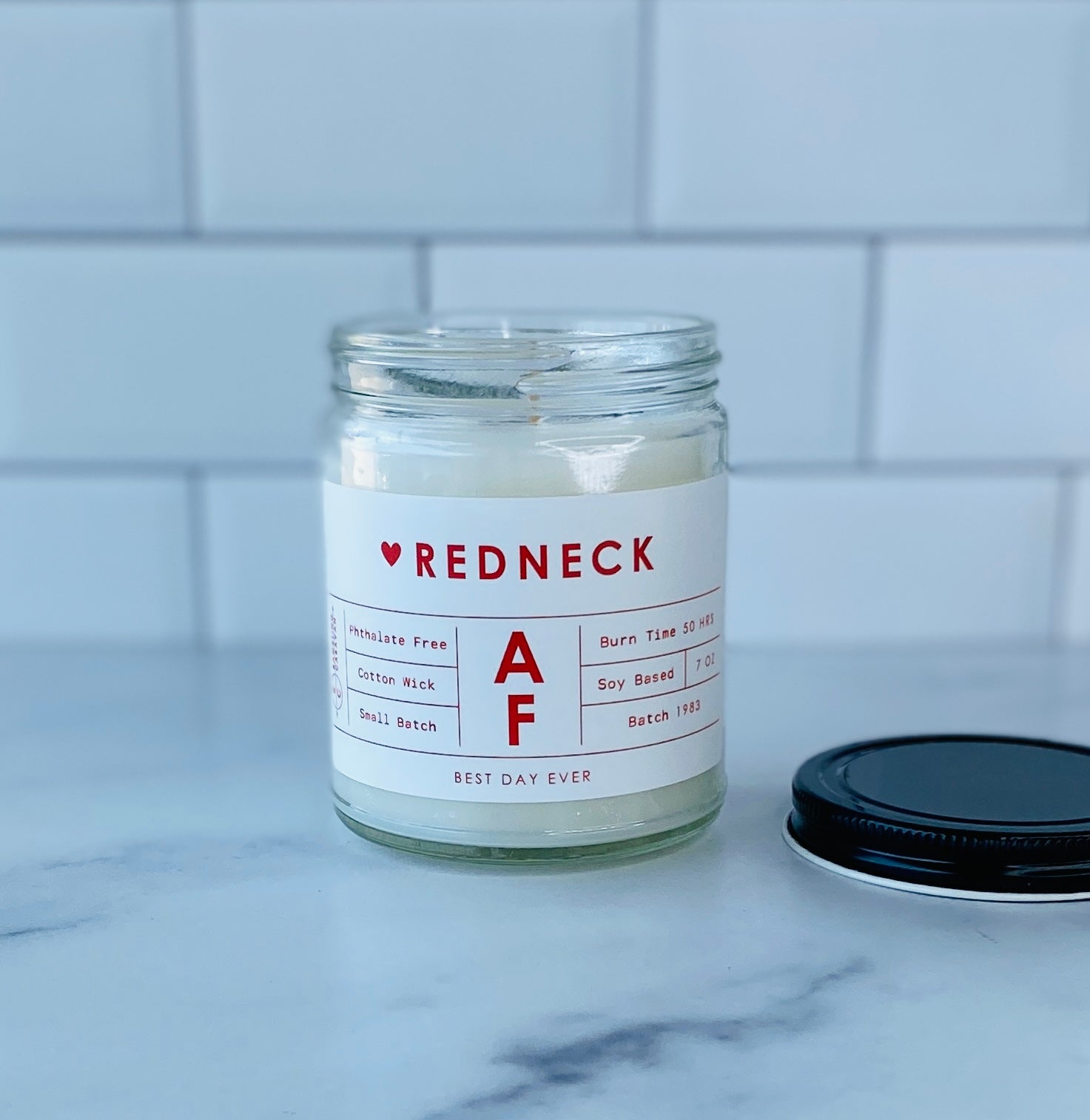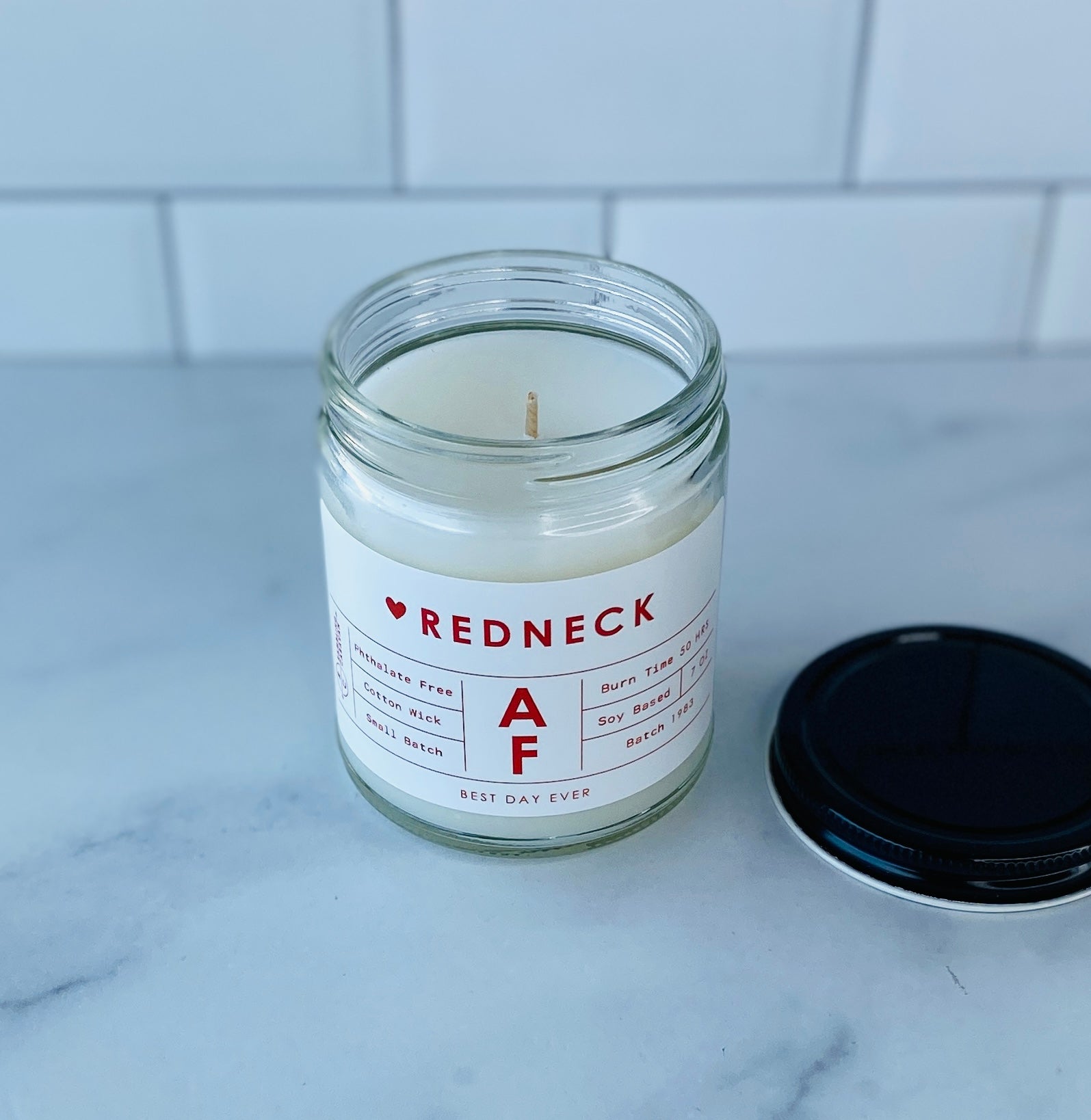 Redneck AF Candle - Rambling Caravan candles are inspired by home, travel and adventure. Made from a soy/coconut based wax blend, the candles are hand poured in Virginia Beach, Virginia. We use phthalate free fragrances and have an assortment of fragrances from which to choose. Many of our candles have different color labels to choose from as well. We use cotton wicks with no zinc or lead. We do not use additives, nor scent enhancers or UV blockers. The burn time is approximately 50 hours.