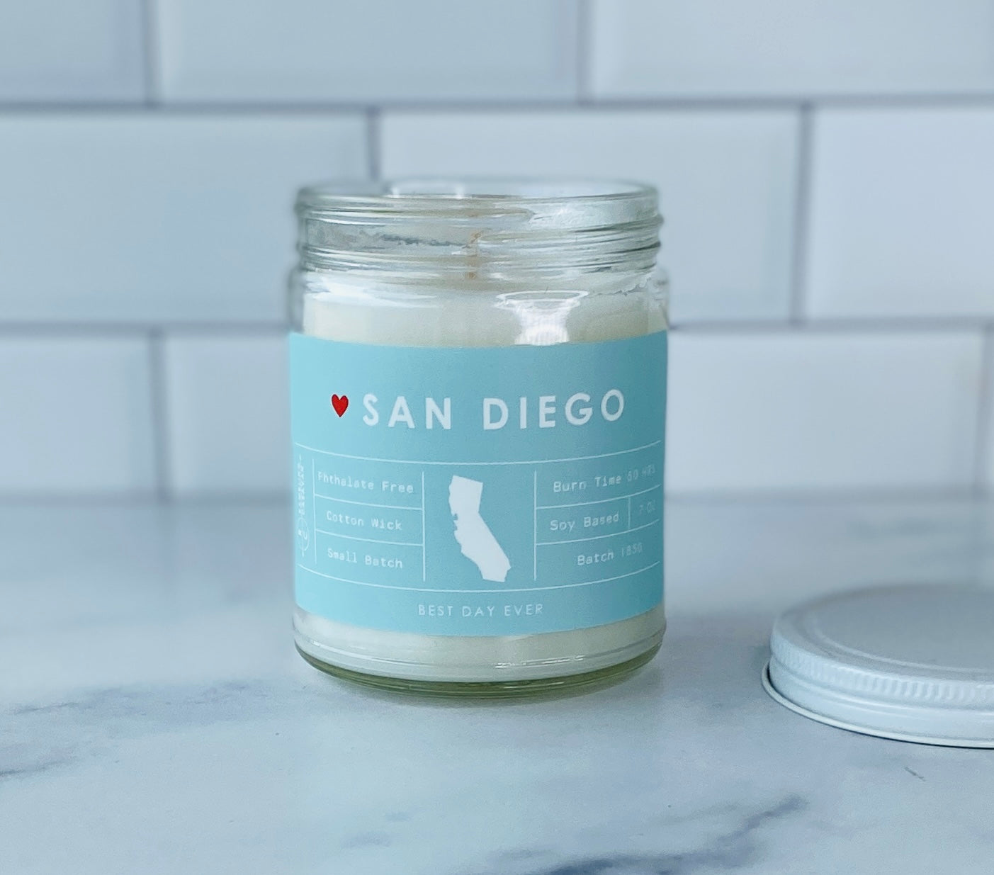 San Diego, California Candle - Rambling Caravan candles are inspired by home, travel and adventure. Made from a soy/coconut based wax blend, the candles are hand poured in Virginia Beach, Virginia. We use phthalate free fragrances and have an assortment of fragrances from which to choose. Many of our candles have different color labels to choose from as well. We use cotton wicks with no zinc or lead. We do not use additives, nor scent enhancers or UV blockers. The burn time is approximately 50 hours.