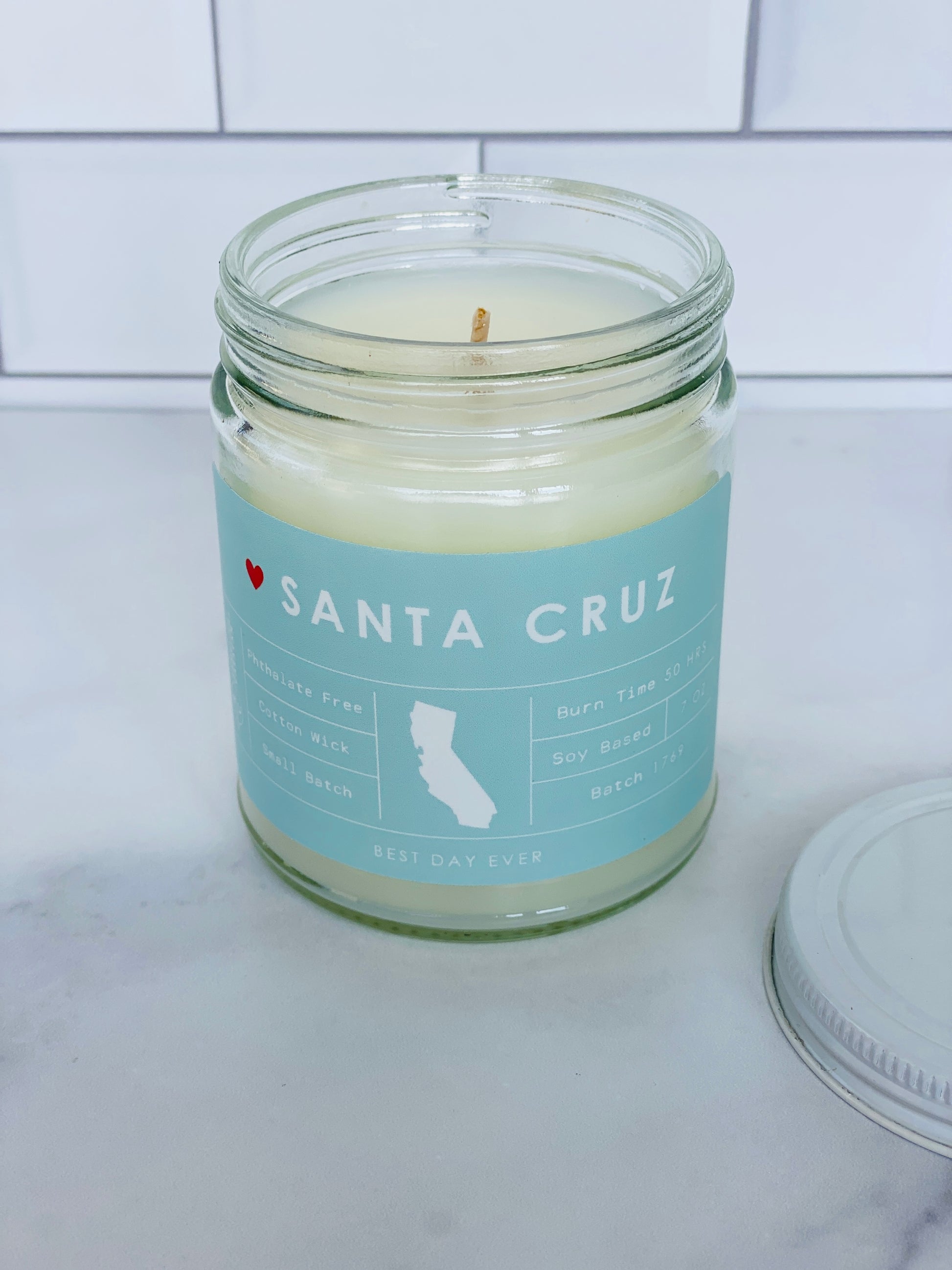 Santa Cruz, California Candle - Rambling Caravan candles are inspired by home, travel and adventure. Made from a soy/coconut based wax blend, the candles are hand poured in Virginia Beach, Virginia. We use phthalate free fragrances and have an assortment of fragrances from which to choose. Many of our candles have different color labels to choose from as well. We use cotton wicks with no zinc or lead. We do not use additives, nor scent enhancers or UV blockers. The burn time is approximately 50 hours.