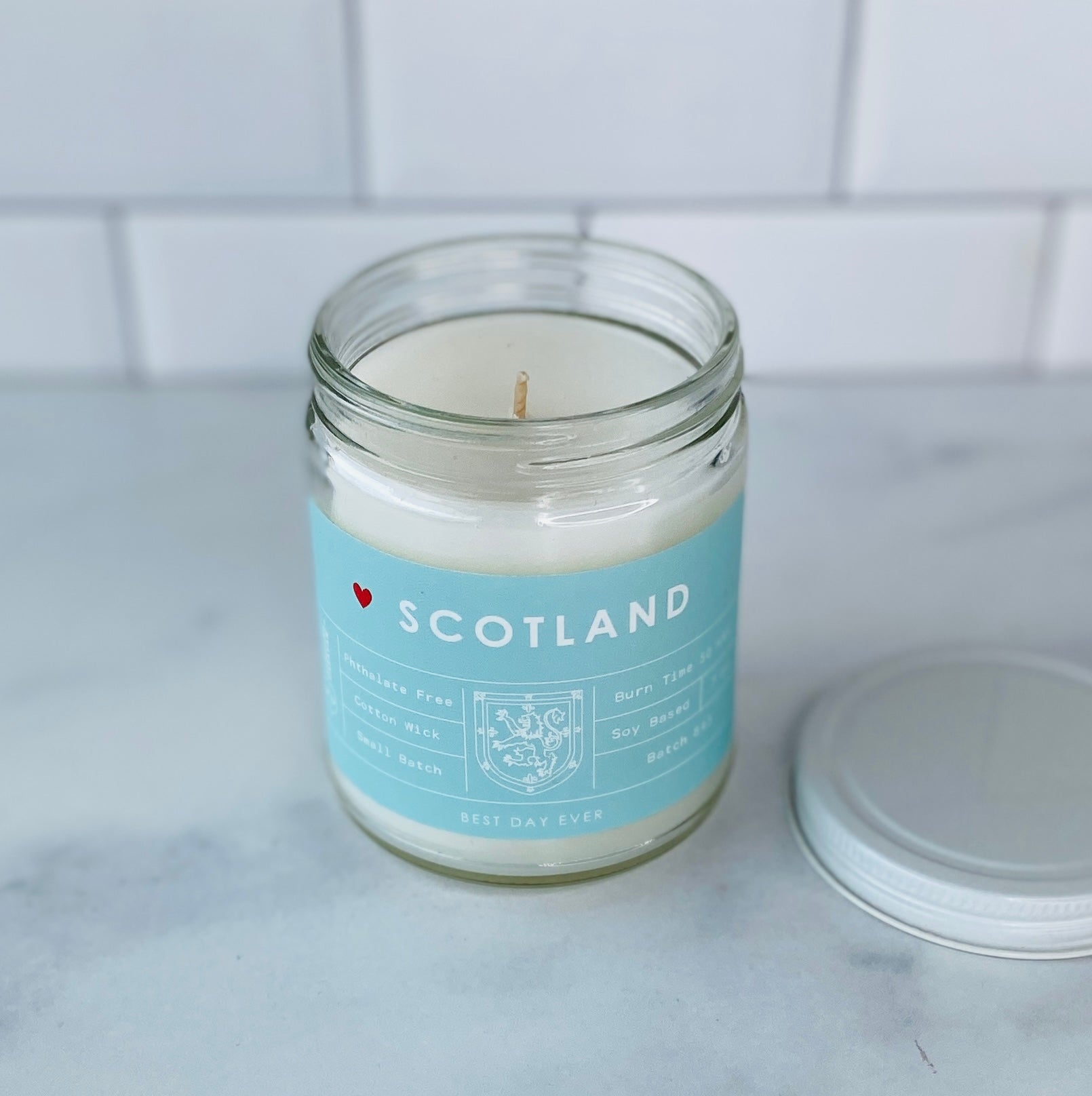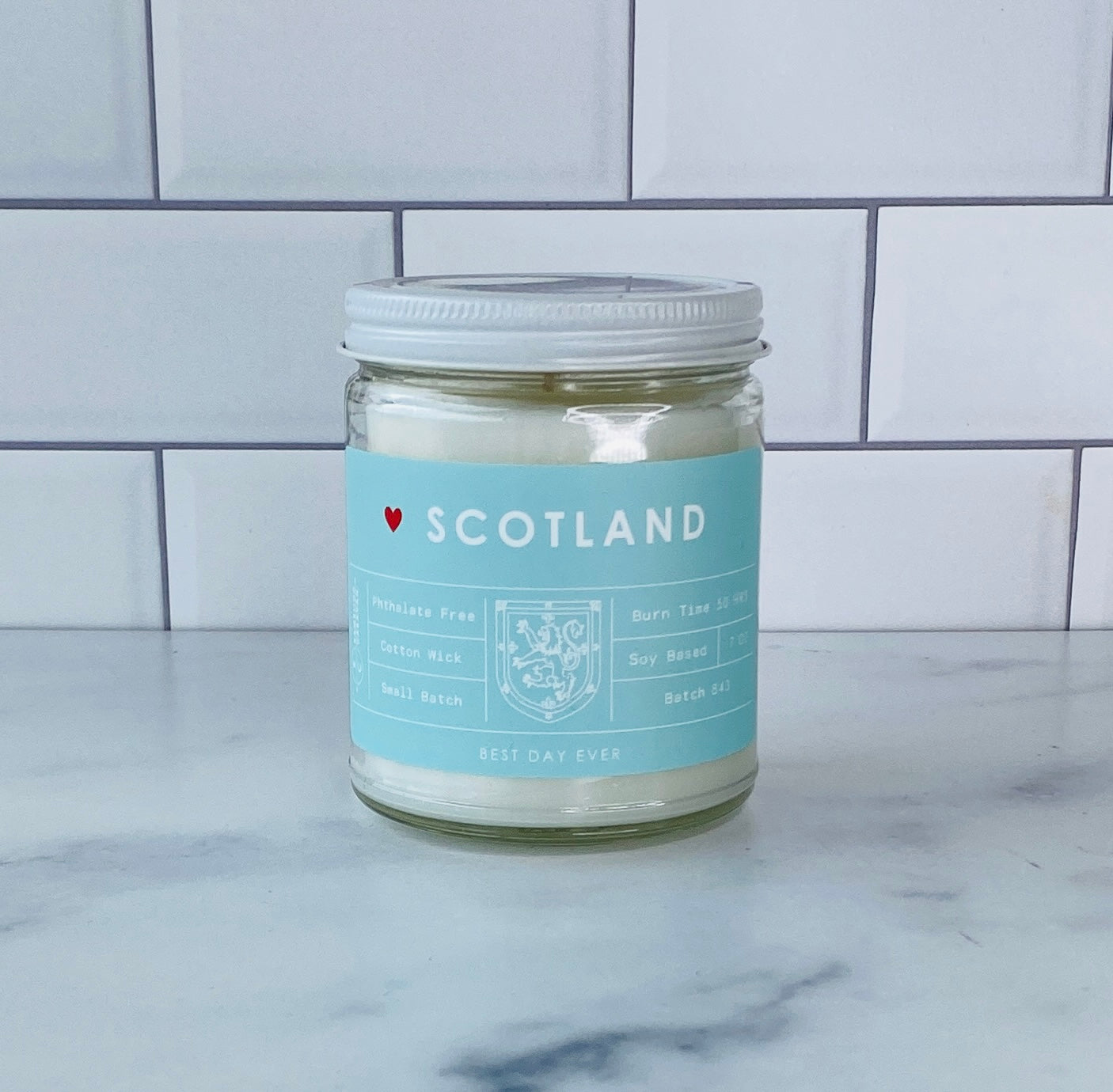 Scotland Candle - Rambling Caravan candles are inspired by home, travel and adventure. Made from a soy/coconut based wax blend, the candles are hand poured in Virginia Beach, Virginia. We use phthalate free fragrances and have an assortment of fragrances from which to choose. Many of our candles have different color labels to choose from as well. We use cotton wicks with no zinc or lead. We do not use additives, nor scent enhancers or UV blockers. The burn time is approximately 50 hours.