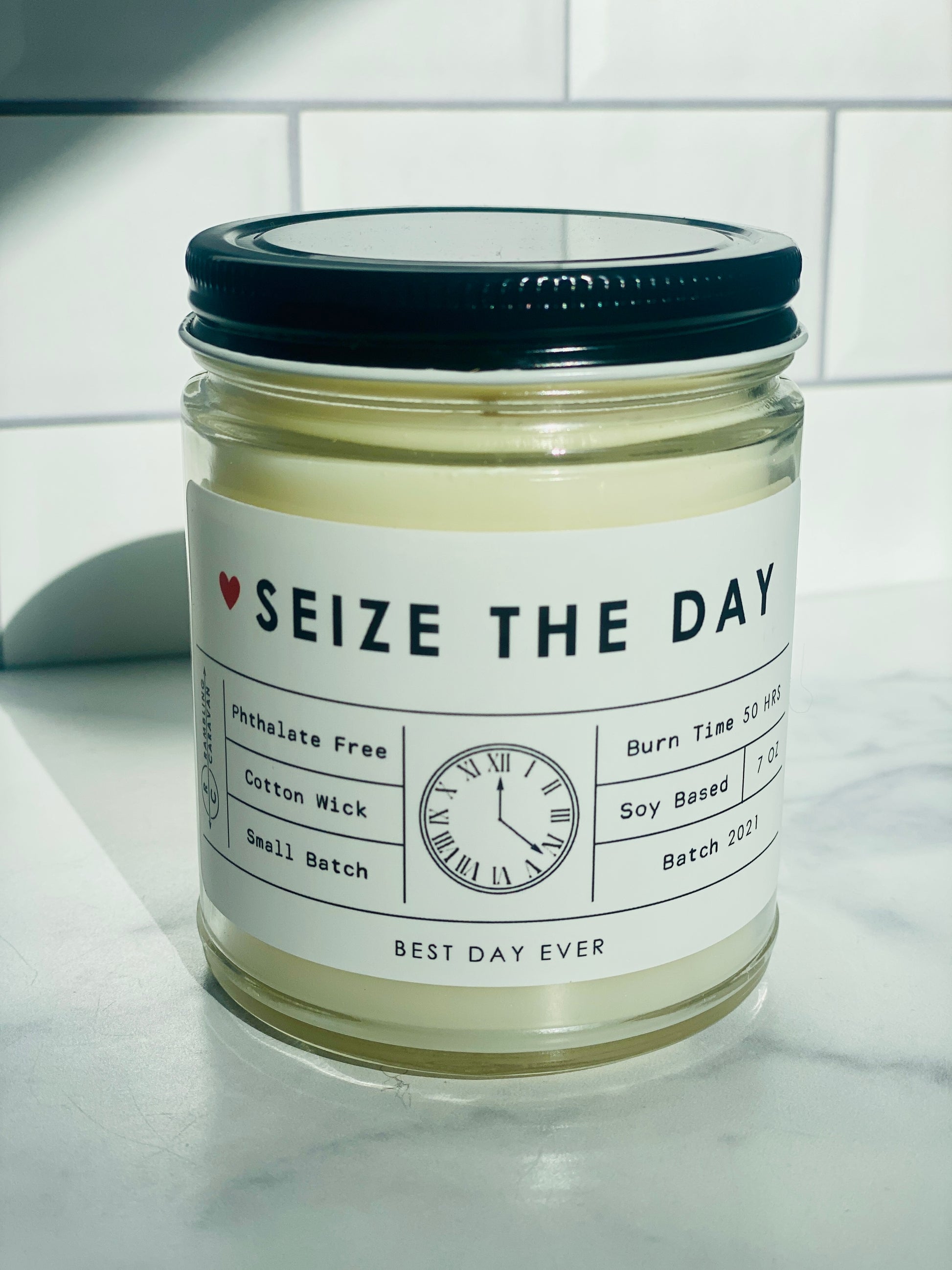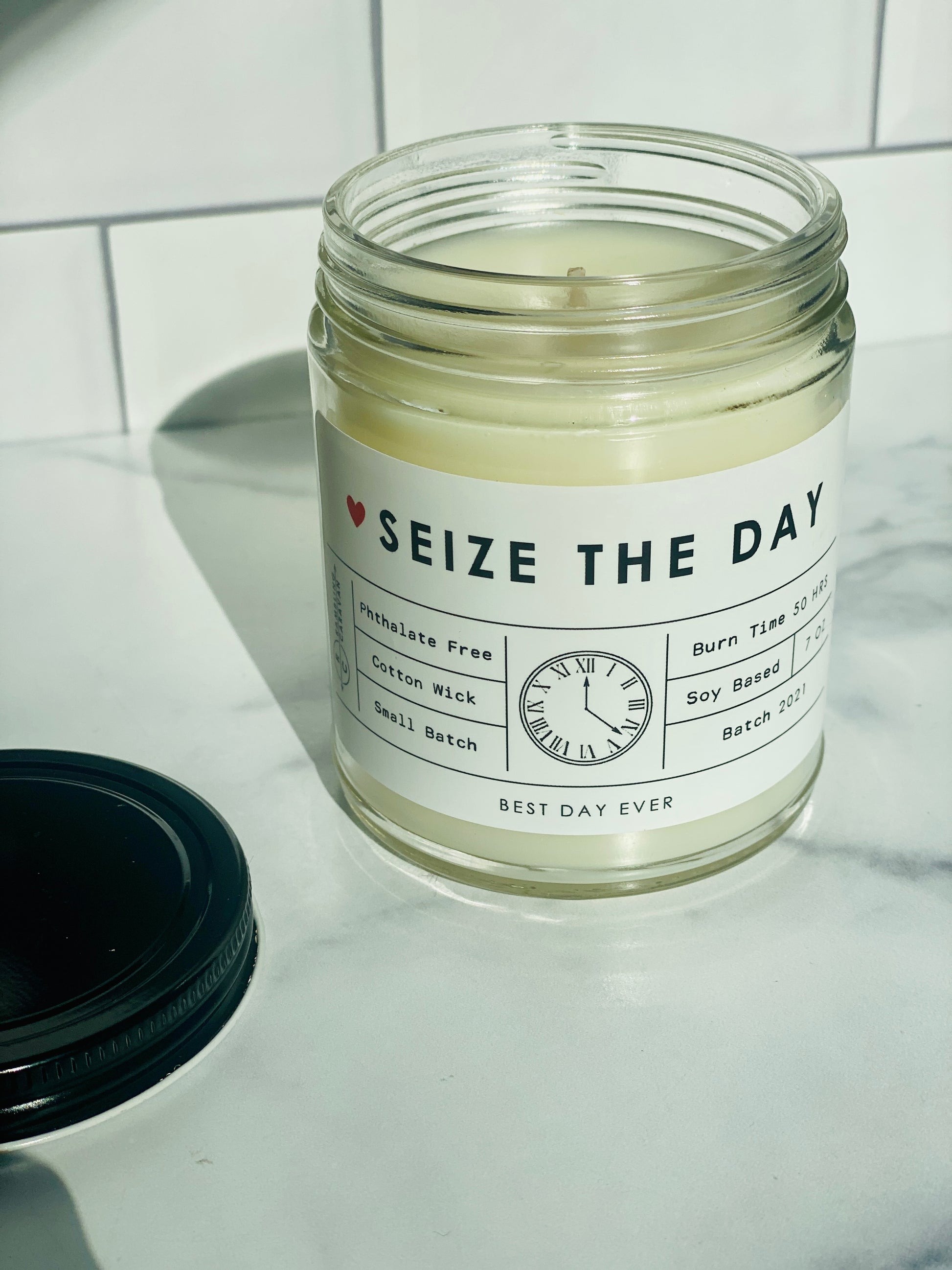 Seize The Day Candle - Rambling Caravan candles are inspired by home, travel and adventure. Made from a soy/coconut based wax blend, the candles are hand poured in Virginia Beach, Virginia. We use phthalate free fragrances and have an assortment of fragrances from which to choose. Many of our candles have different color labels to choose from as well. We use cotton wicks with no zinc or lead. We do not use additives, nor scent enhancers or UV blockers. The burn time is approximately 50 hours.