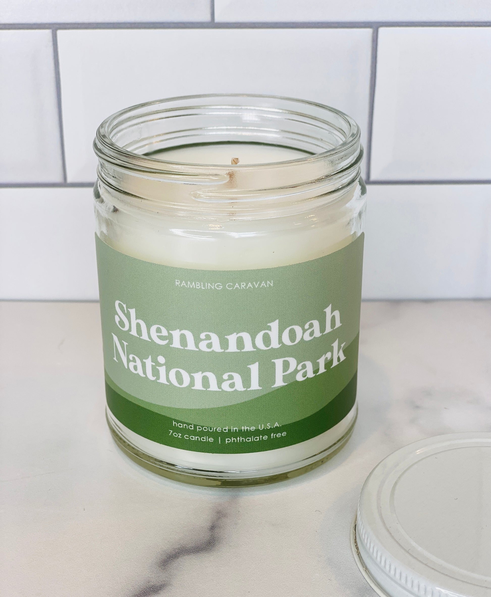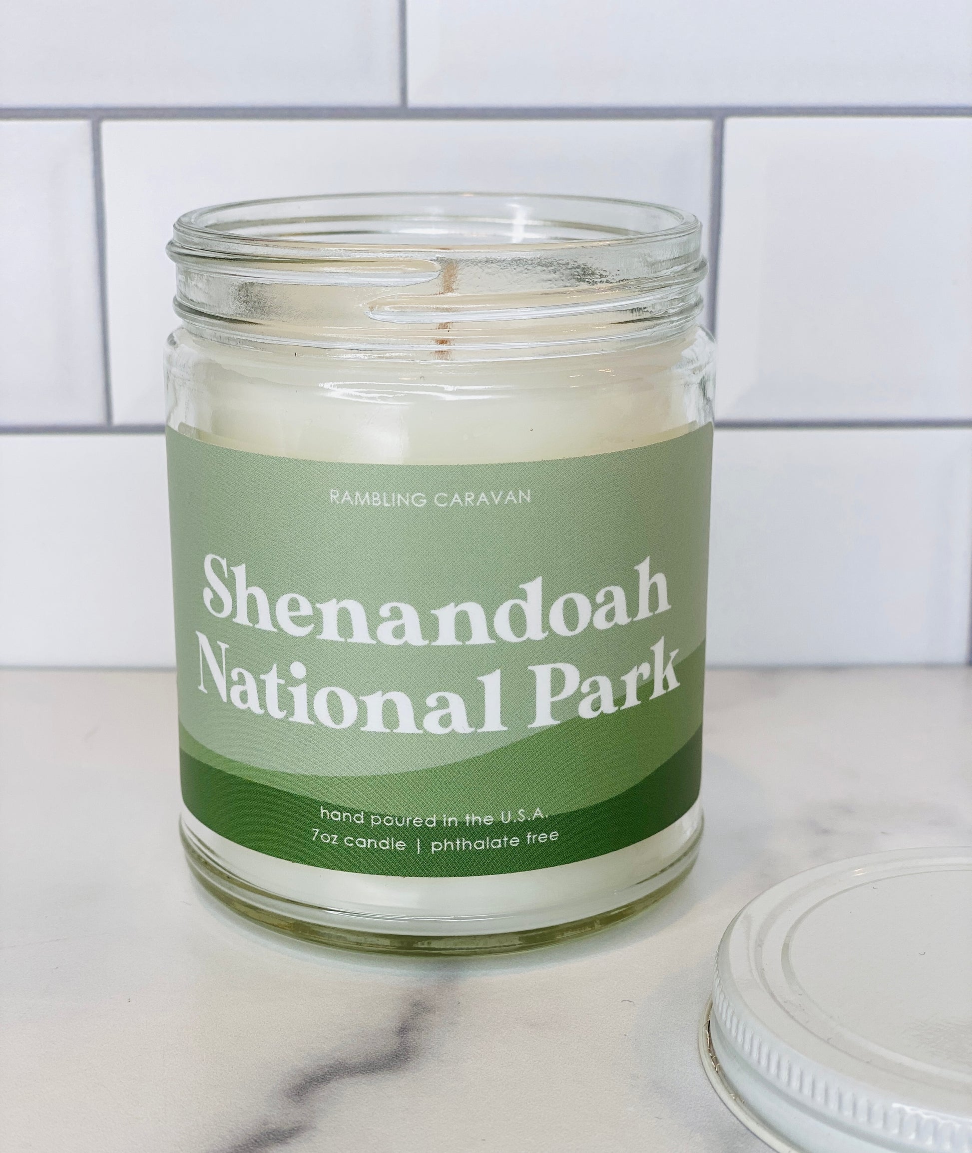 Shenandoah National Park Candle - Rambling Caravan candles are inspired by home, travel and adventure. Made from a soy/coconut based wax blend, the candles are hand poured in Virginia Beach, Virginia. We use phthalate free fragrances and have an assortment of fragrances from which to choose. Many of our candles have different color labels to choose from as well. We use cotton wicks with no zinc or lead. We do not use additives, nor scent enhancers or UV blockers. The burn time is approximately 50 hours.