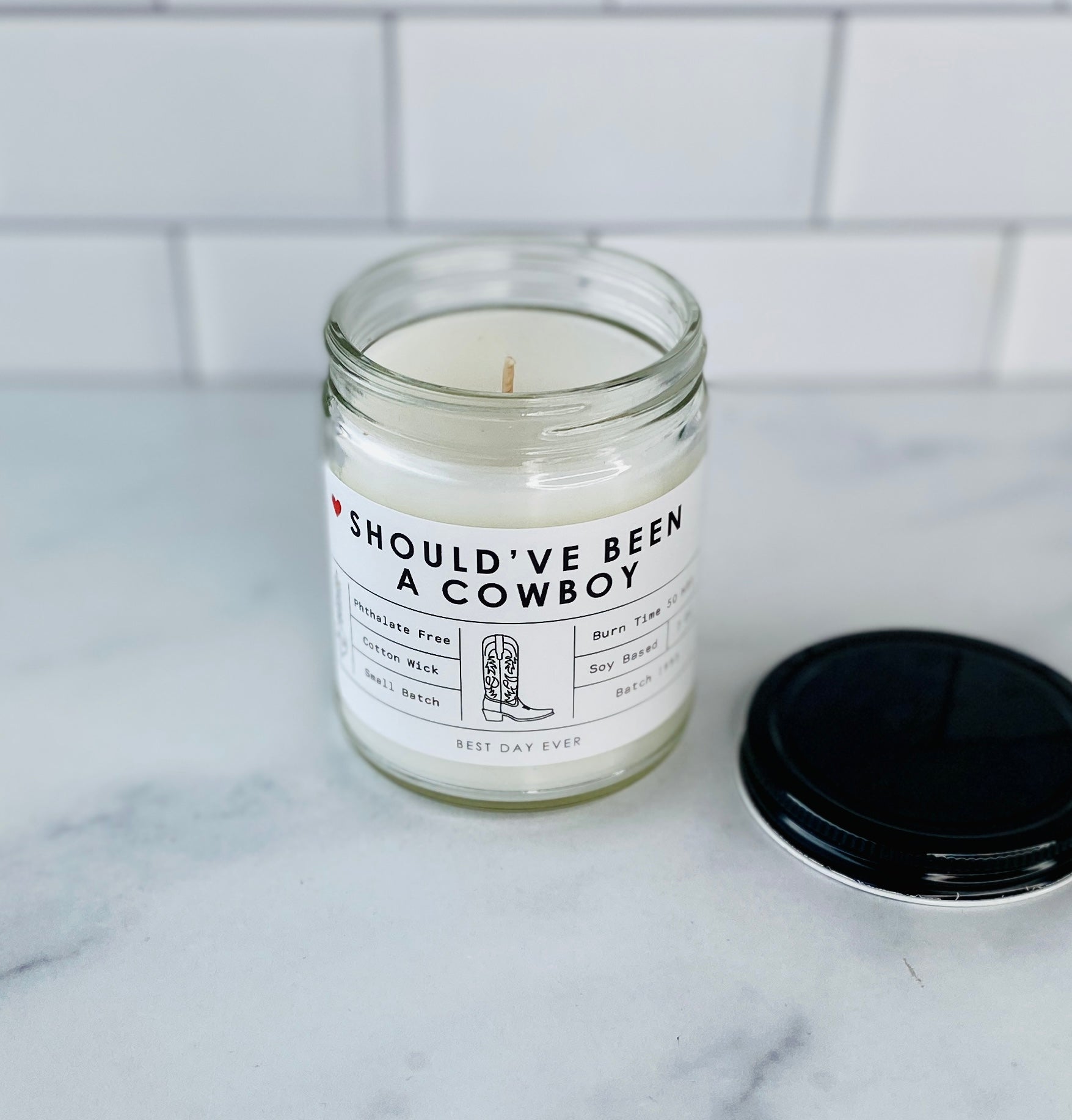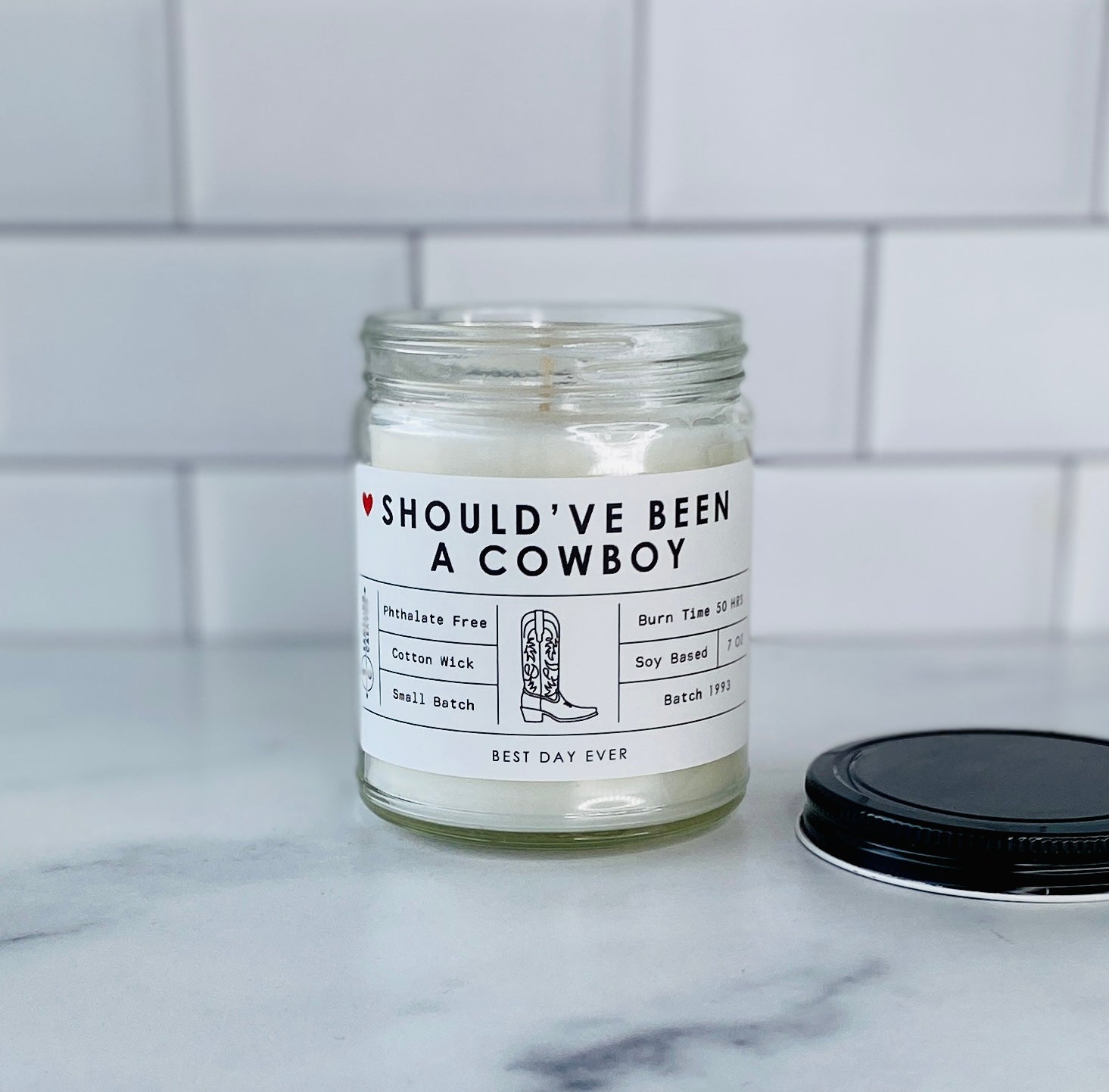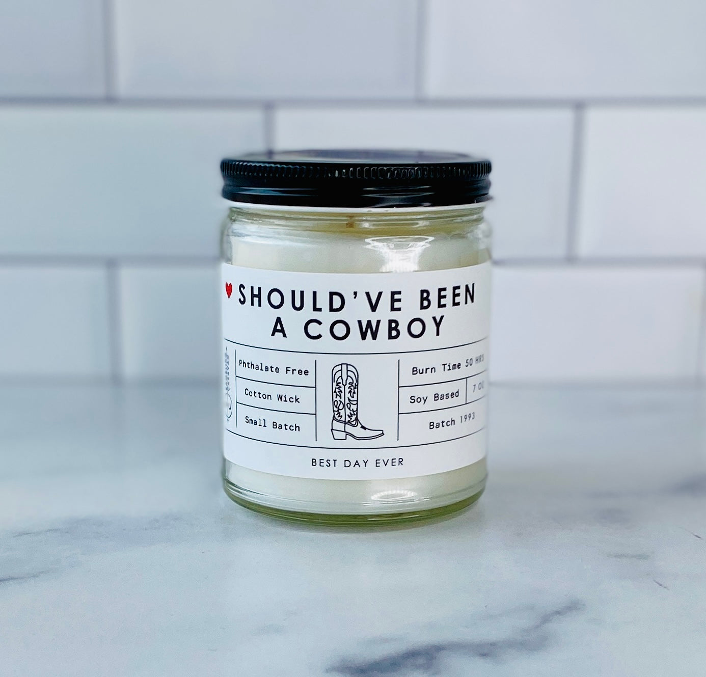 Should've Been A Cowboy Candle - Rambling Caravan candles are inspired by home, travel and adventure. Made from a soy/coconut based wax blend, the candles are hand poured in Virginia Beach, Virginia. We use phthalate free fragrances and have an assortment of fragrances from which to choose. Many of our candles have different color labels to choose from as well. We use cotton wicks with no zinc or lead. We do not use additives, nor scent enhancers or UV blockers. The burn time is approximately 50 hours.