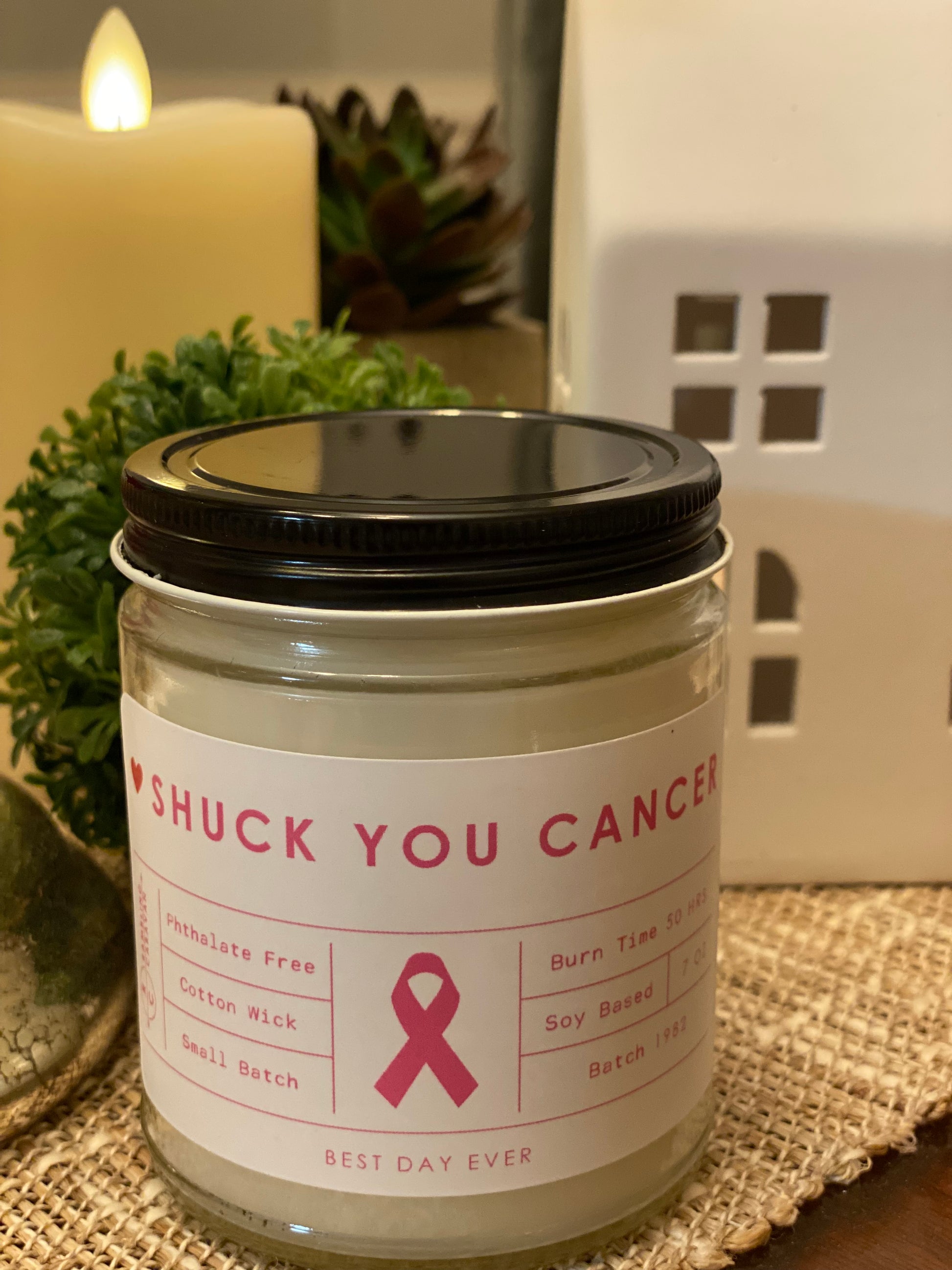 Shuck You Cancer (Breast Cancer) Pink Candle - Rambling Caravan candles are inspired by home, travel and adventure. Made from a soy/coconut based wax blend, the candles are hand poured in Virginia Beach, Virginia. We use phthalate free fragrances and have an assortment of fragrances from which to choose. Many of our candles have different color labels to choose from as well. We use cotton wicks with no zinc or lead. We do not use additives, nor scent enhancers or UV blockers. The burn time is approximately 50 hours.
