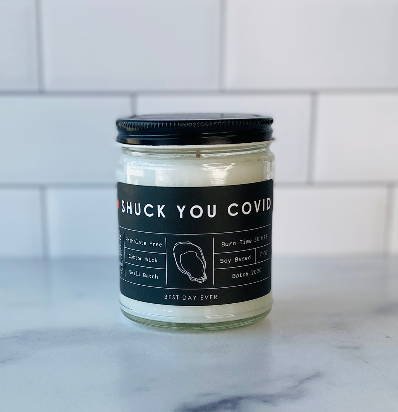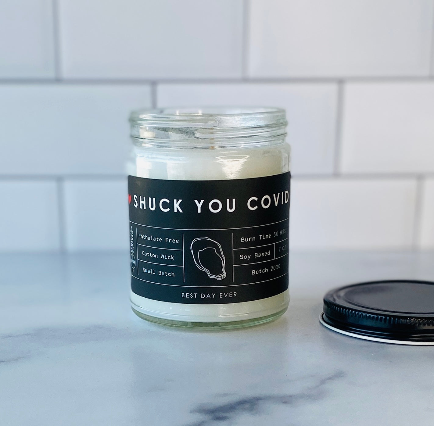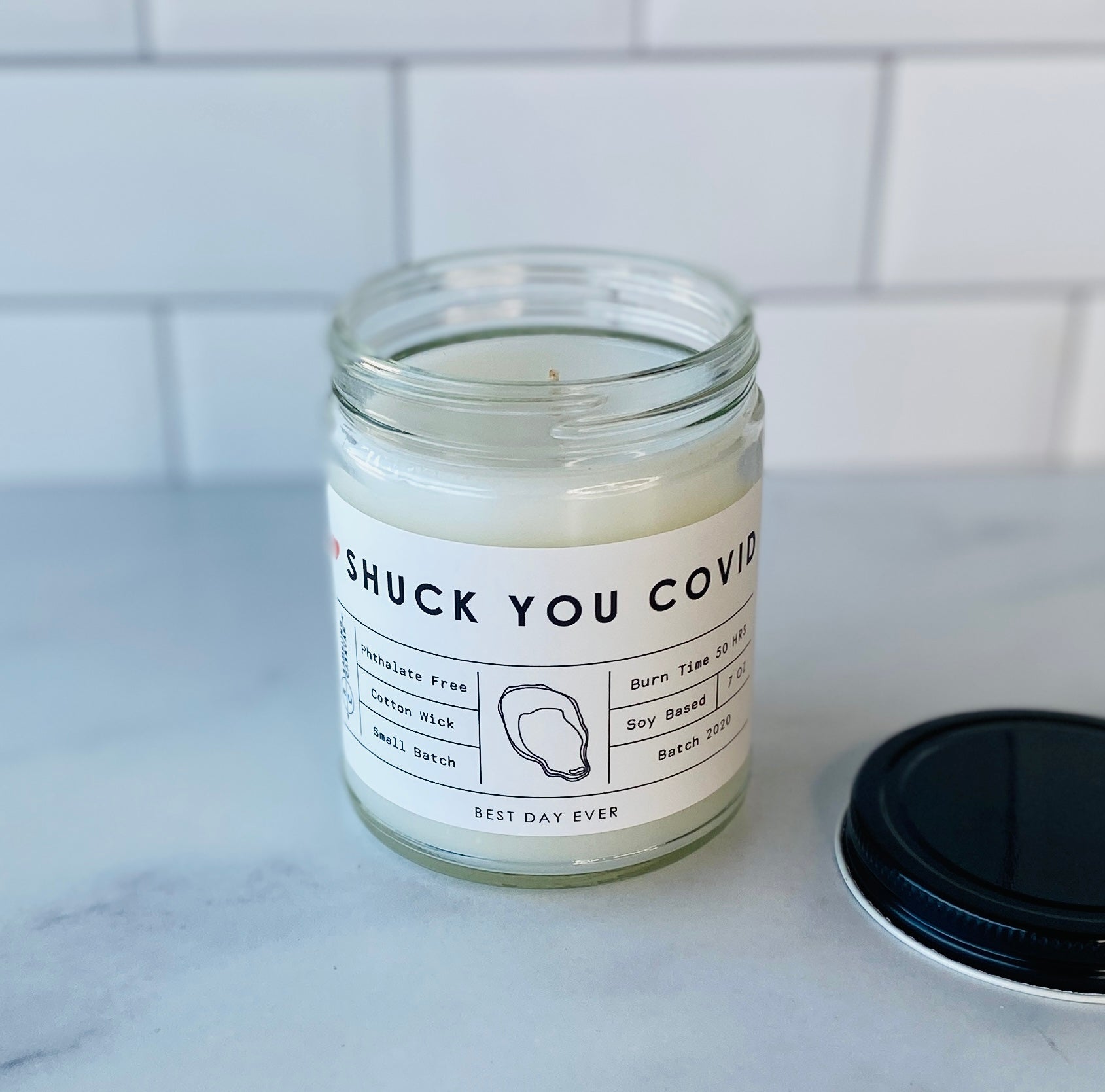 Shuck You Covid Candle - Rambling Caravan candles are inspired by home, travel and adventure. Made from a soy/coconut based wax blend, the candles are hand poured in Virginia Beach, Virginia. We use phthalate free fragrances and have an assortment of fragrances from which to choose. Many of our candles have different color labels to choose from as well. We use cotton wicks with no zinc or lead. We do not use additives, nor scent enhancers or UV blockers. The burn time is approximately 50 hours.