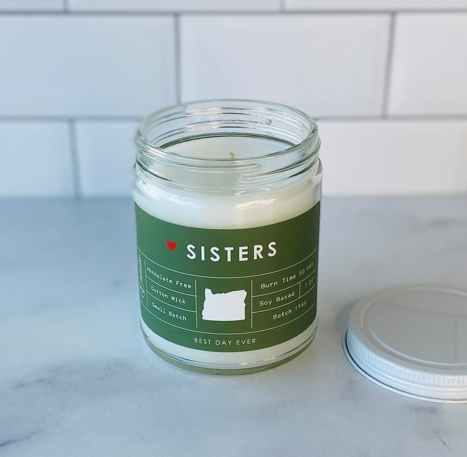 Sisters, Oregon Candle - Rambling Caravan candles are inspired by home, travel and adventure. Made from a soy/coconut based wax blend, the candles are hand poured in Virginia Beach, Virginia. We use phthalate free fragrances and have an assortment of fragrances from which to choose. Many of our candles have different color labels to choose from as well. We use cotton wicks with no zinc or lead. We do not use additives, nor scent enhancers or UV blockers. The burn time is approximately 50 hours.