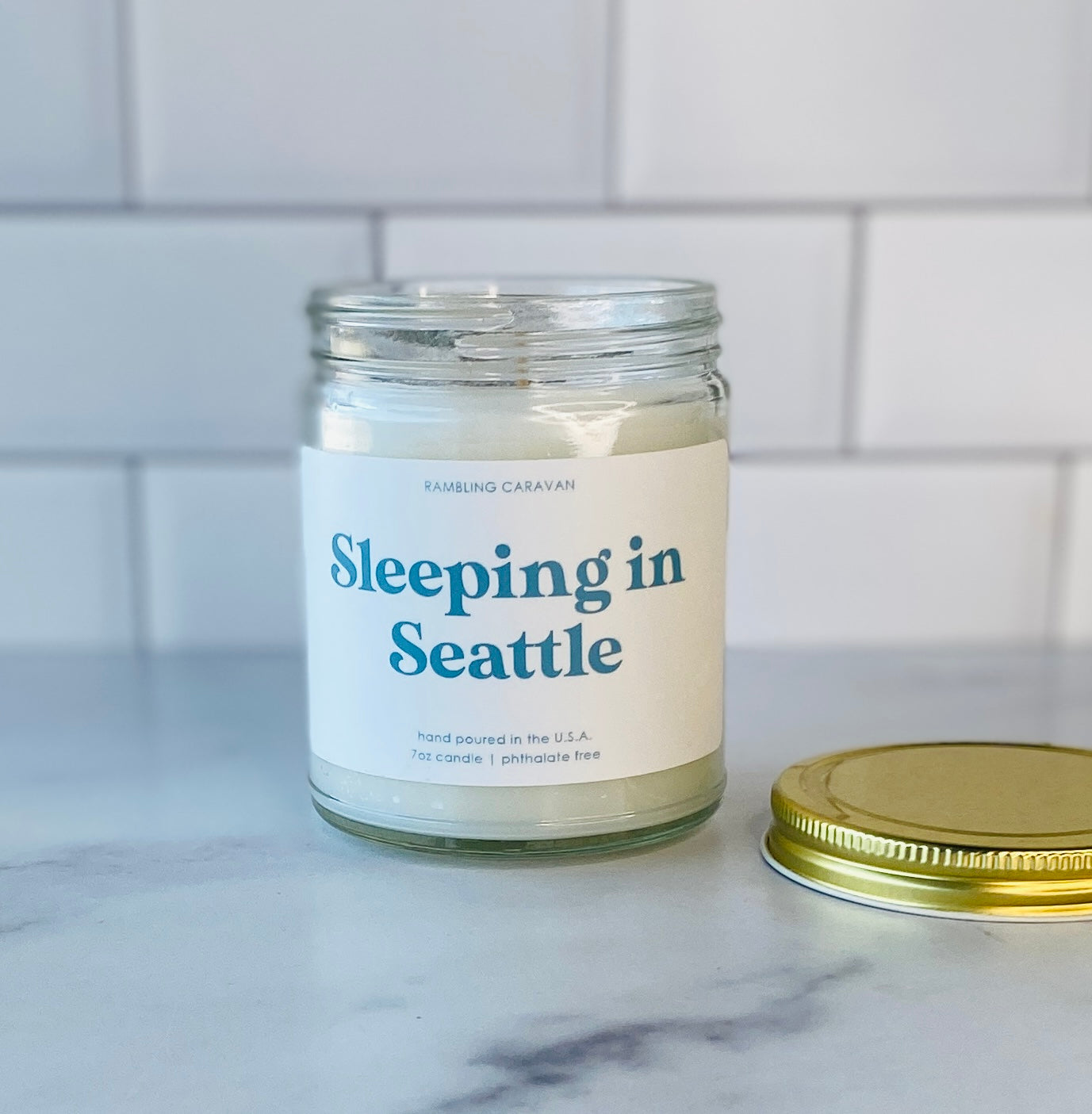 Sleeping in Seattle Candle - Rambling Caravan candles are inspired by home, travel and adventure. Made from a soy/coconut based wax blend, the candles are hand poured in Virginia Beach, Virginia. We use phthalate free fragrances and have an assortment of fragrances from which to choose. Many of our candles have different color labels to choose from as well. We use cotton wicks with no zinc or lead. We do not use additives, nor scent enhancers or UV blockers. The burn time is approximately 50 hours.