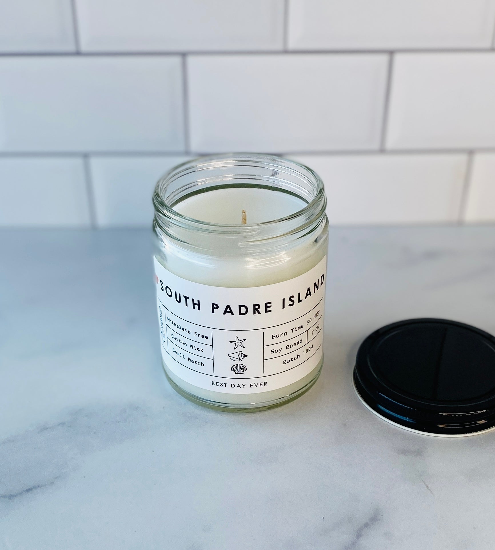 South Padre Island, Texas Candle - Rambling Caravan candles are inspired by home, travel and adventure. Made from a soy/coconut based wax blend, the candles are hand poured in Virginia Beach, Virginia. We use phthalate free fragrances and have an assortment of fragrances from which to choose. Many of our candles have different color labels to choose from as well. We use cotton wicks with no zinc or lead. We do not use additives, nor scent enhancers or UV blockers. The burn time is approximately 50 hours.