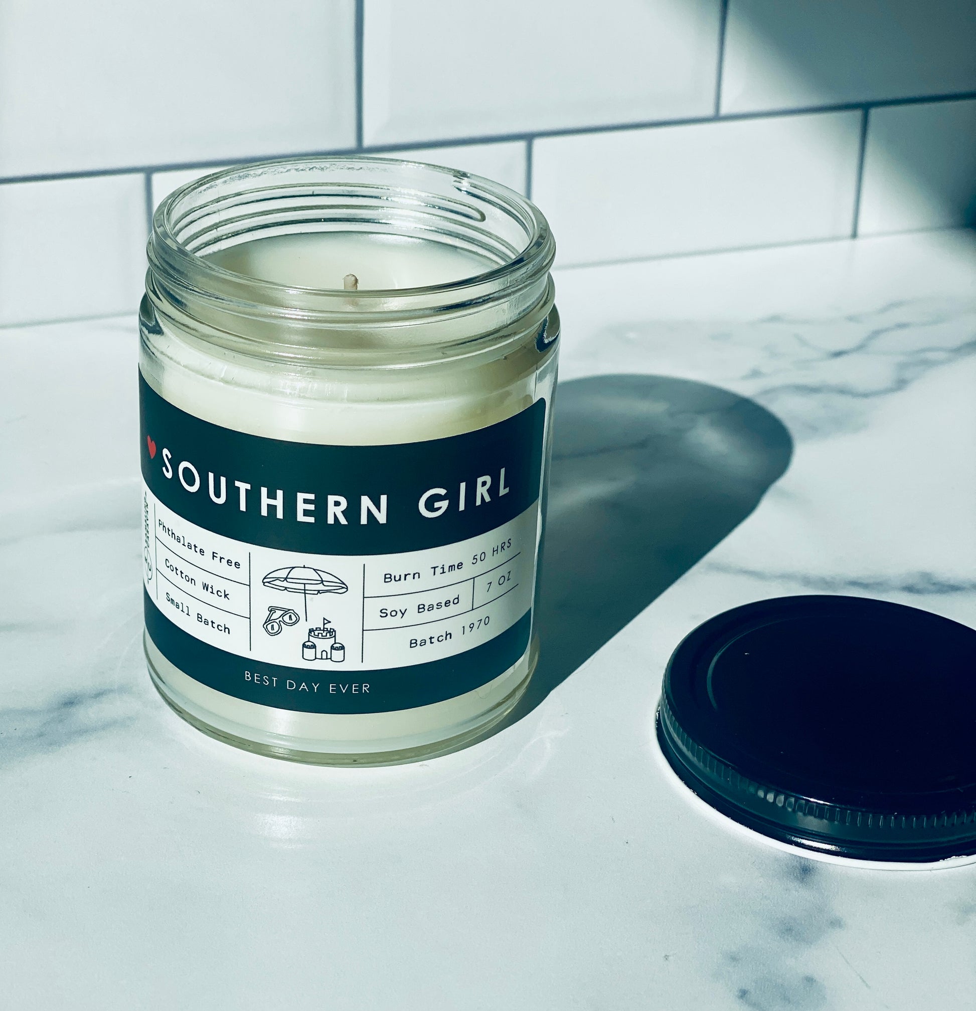 Southern Girl Candle - Rambling Caravan candles are inspired by home, travel and adventure. Made from a soy/coconut based wax blend, the candles are hand poured in Virginia Beach, Virginia. We use phthalate free fragrances and have an assortment of fragrances from which to choose. Many of our candles have different color labels to choose from as well. We use cotton wicks with no zinc or lead. We do not use additives, nor scent enhancers or UV blockers. The burn time is approximately 50 hours.