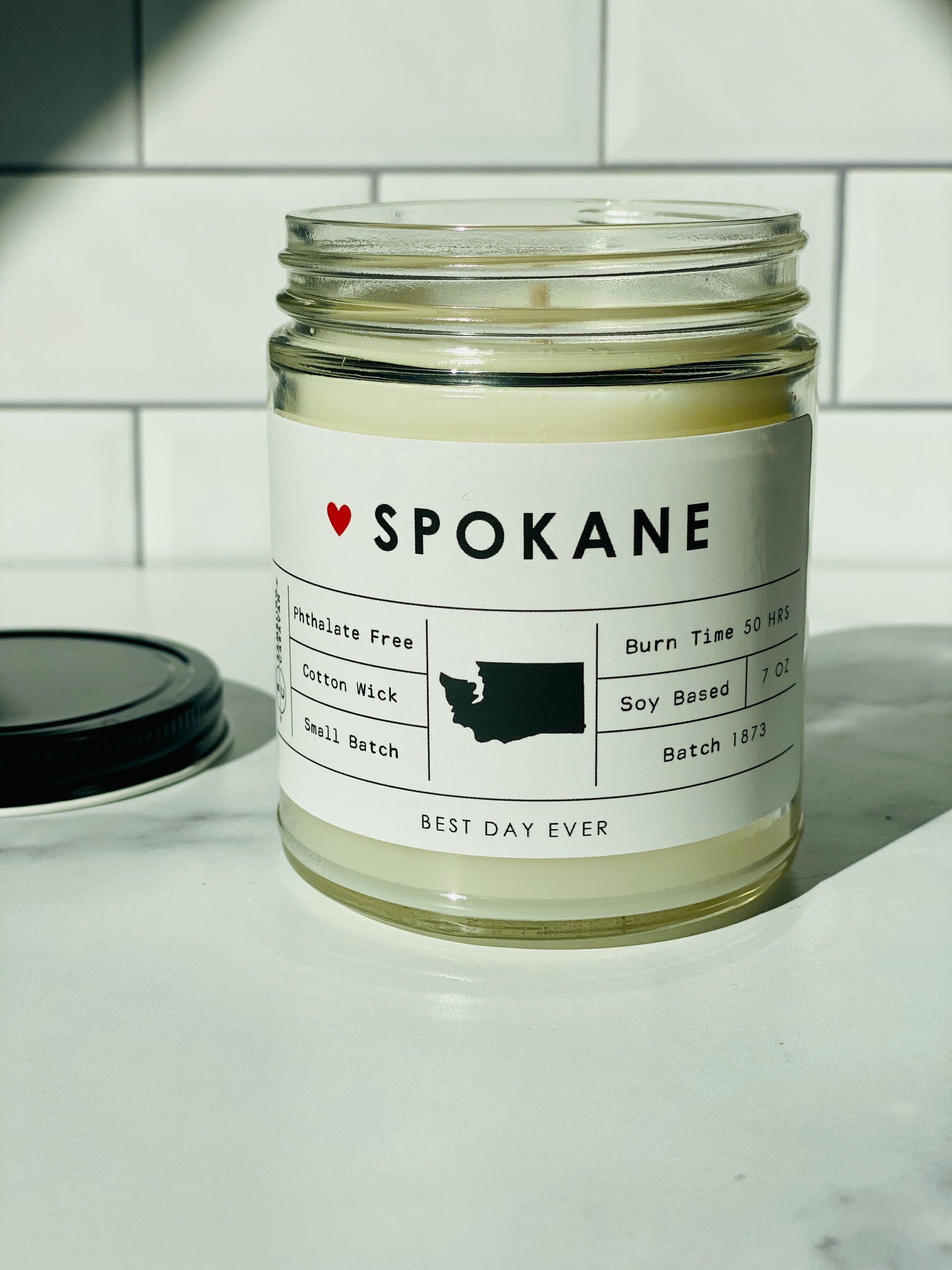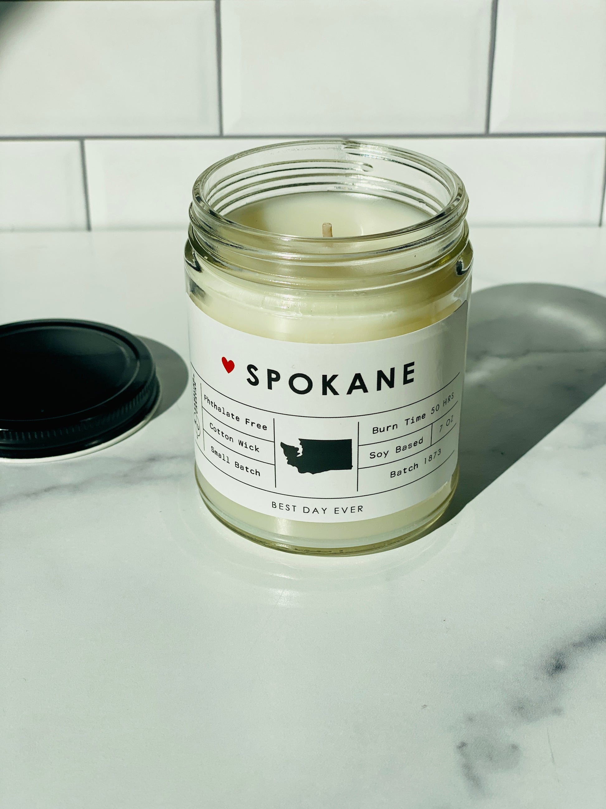 Spokane, Washington Candle - Rambling Caravan candles are inspired by home, travel and adventure. Made from a soy/coconut based wax blend, the candles are hand poured in Virginia Beach, Virginia. We use phthalate free fragrances and have an assortment of fragrances from which to choose. Many of our candles have different color labels to choose from as well. We use cotton wicks with no zinc or lead. We do not use additives, nor scent enhancers or UV blockers. The burn time is approximately 50 hours.