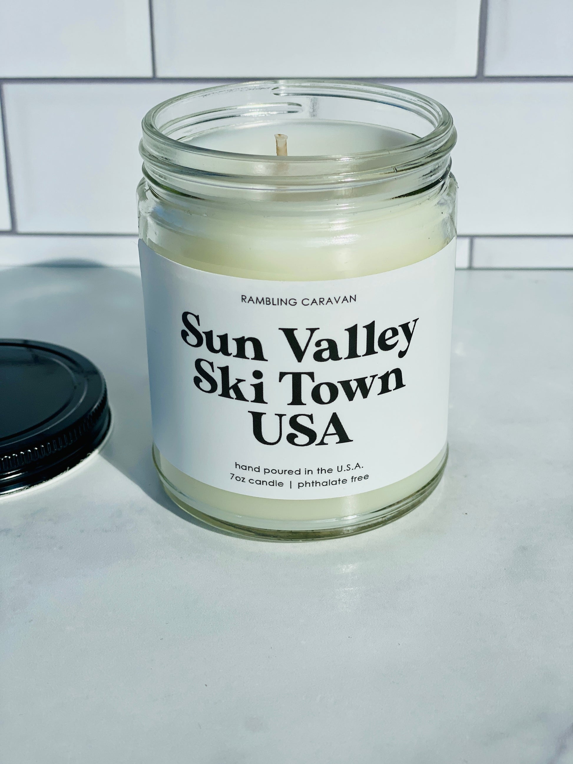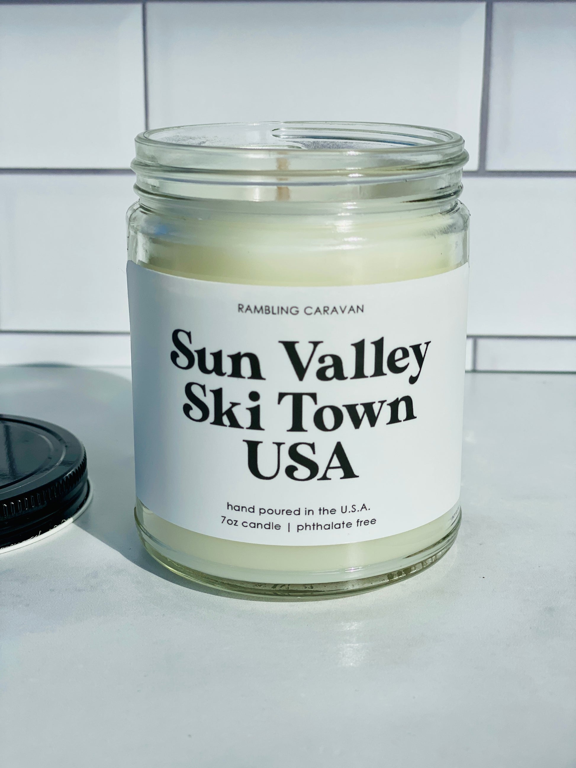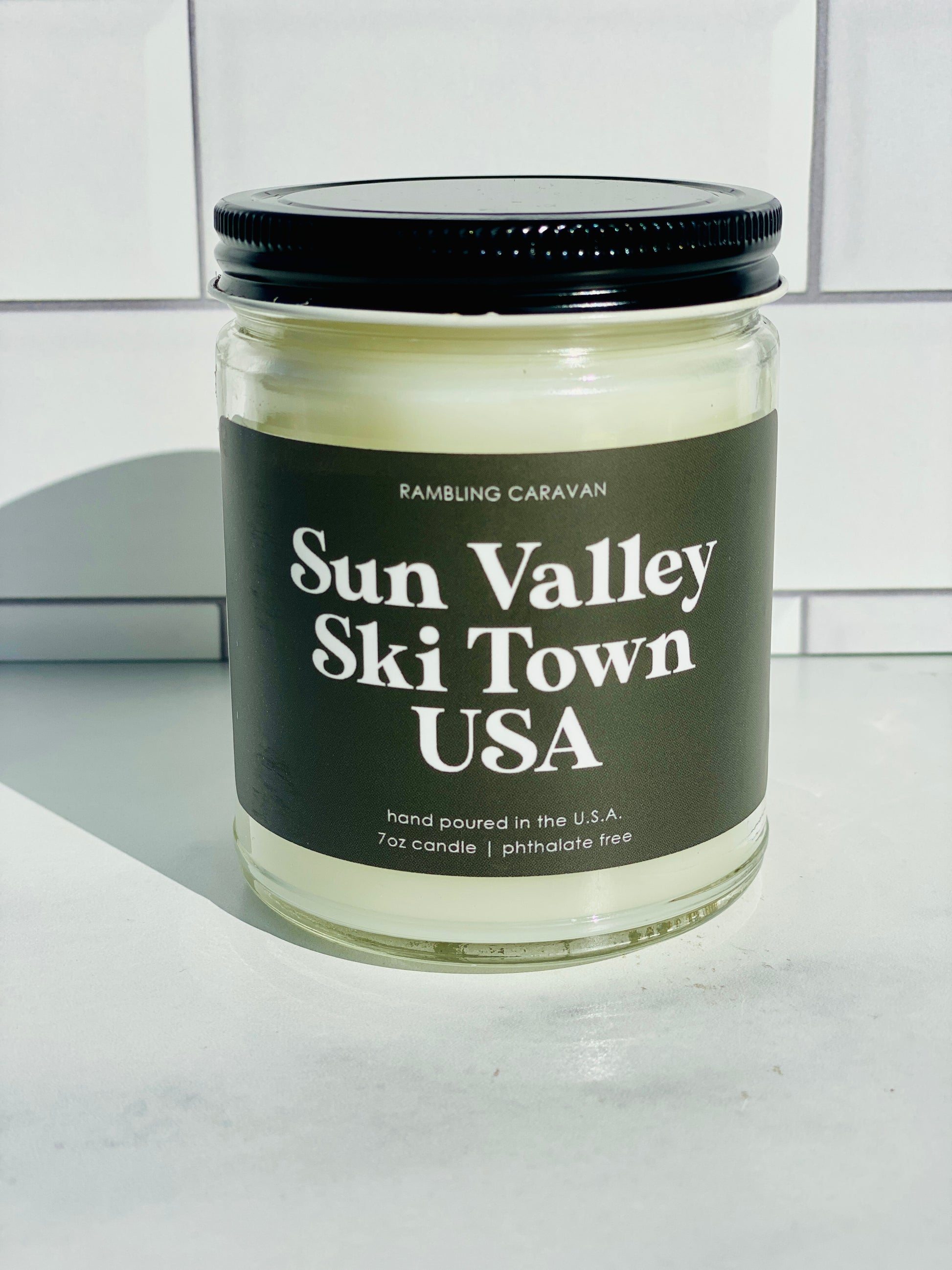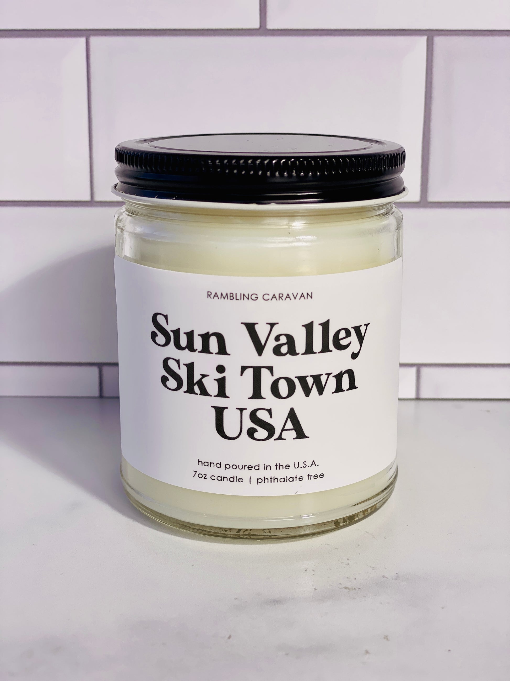 Sun Valley Ski Town USA Candle - Rambling Caravan candles are inspired by home, travel and adventure. Made from a soy/coconut based wax blend, the candles are hand poured in Virginia Beach, Virginia. We use phthalate free fragrances and have an assortment of fragrances from which to choose. Many of our candles have different color labels to choose from as well. We use cotton wicks with no zinc or lead. We do not use additives, nor scent enhancers or UV blockers. The burn time is approximately 50 hours.