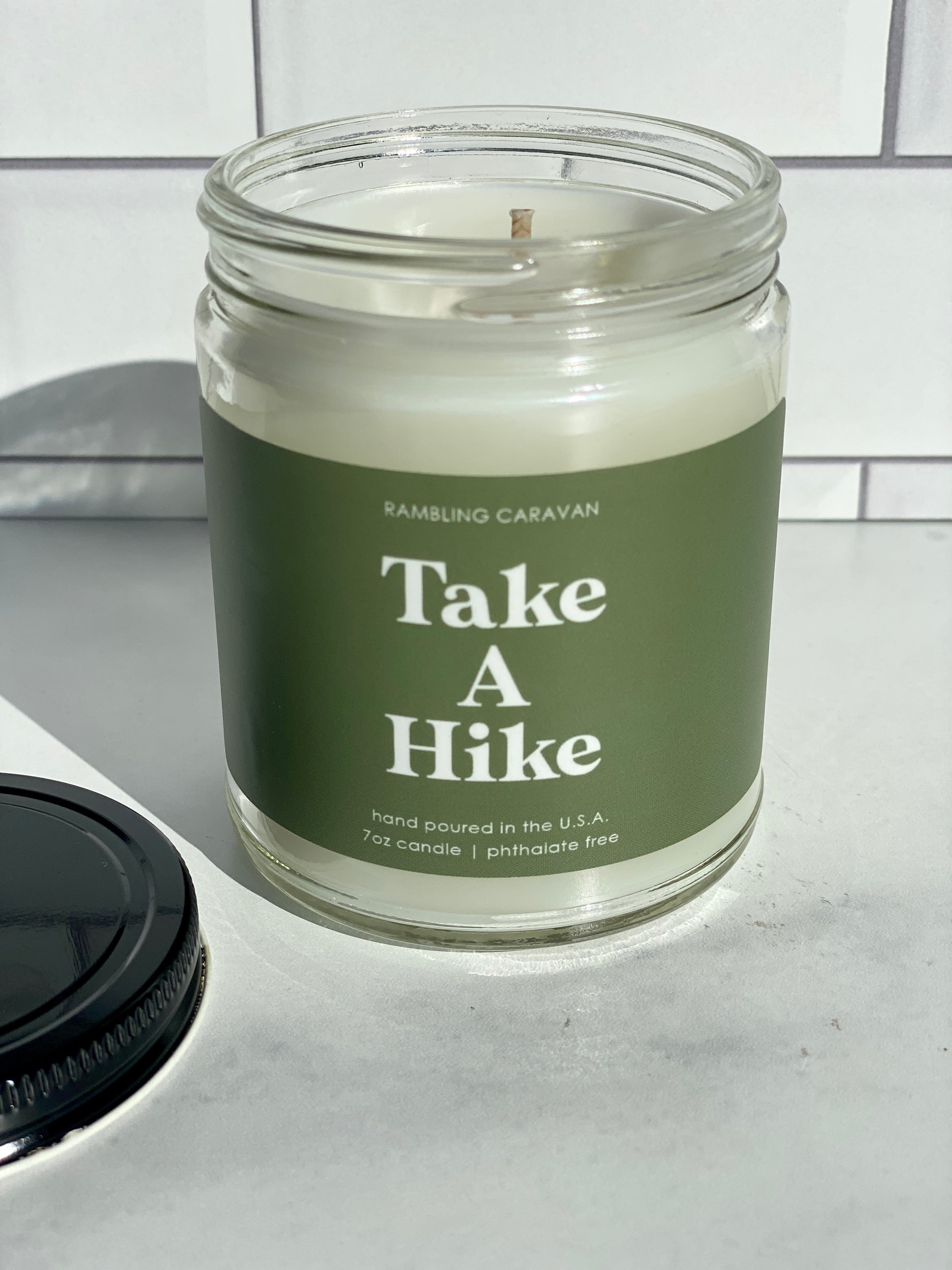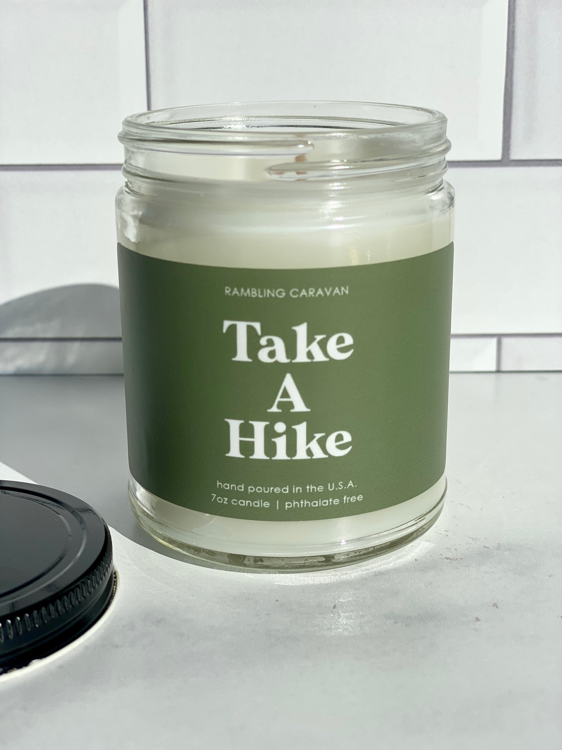 Take A Hike Candle - Rambling Caravan candles are inspired by home, travel and adventure. Made from a soy/coconut based wax blend, the candles are hand poured in Virginia Beach, Virginia. We use phthalate free fragrances and have an assortment of fragrances from which to choose. Many of our candles have different color labels to choose from as well. We use cotton wicks with no zinc or lead. We do not use additives, nor scent enhancers or UV blockers. The burn time is approximately 50 hours.
