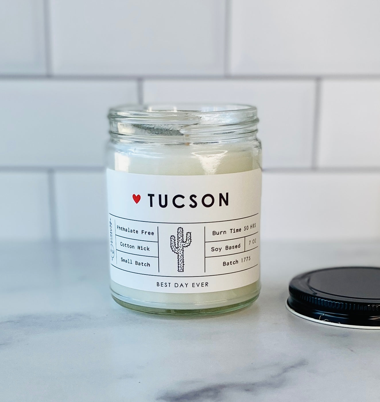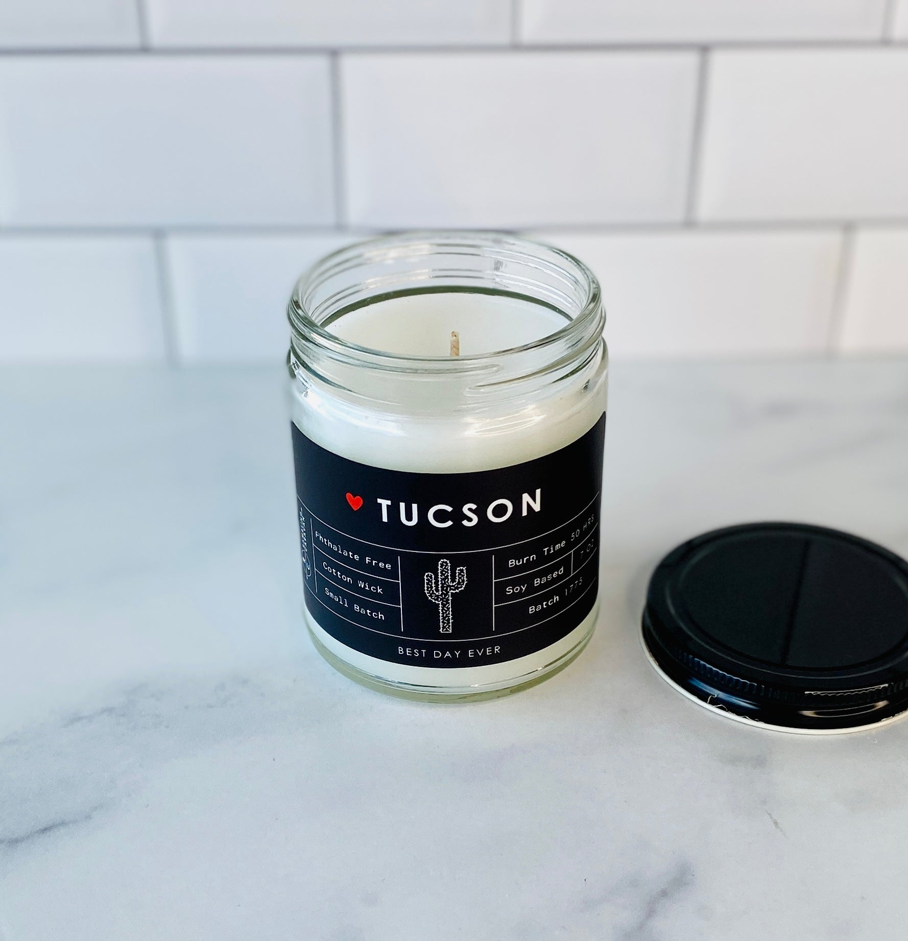 Tucson, Arizona Candle - Rambling Caravan candles are inspired by home, travel and adventure. Made from a soy/coconut based wax blend, the candles are hand poured in Virginia Beach, Virginia. We use phthalate free fragrances and have an assortment of fragrances from which to choose. Many of our candles have different color labels to choose from as well. We use cotton wicks with no zinc or lead. We do not use additives, nor scent enhancers or UV blockers. The burn time is approximately 50 hours.