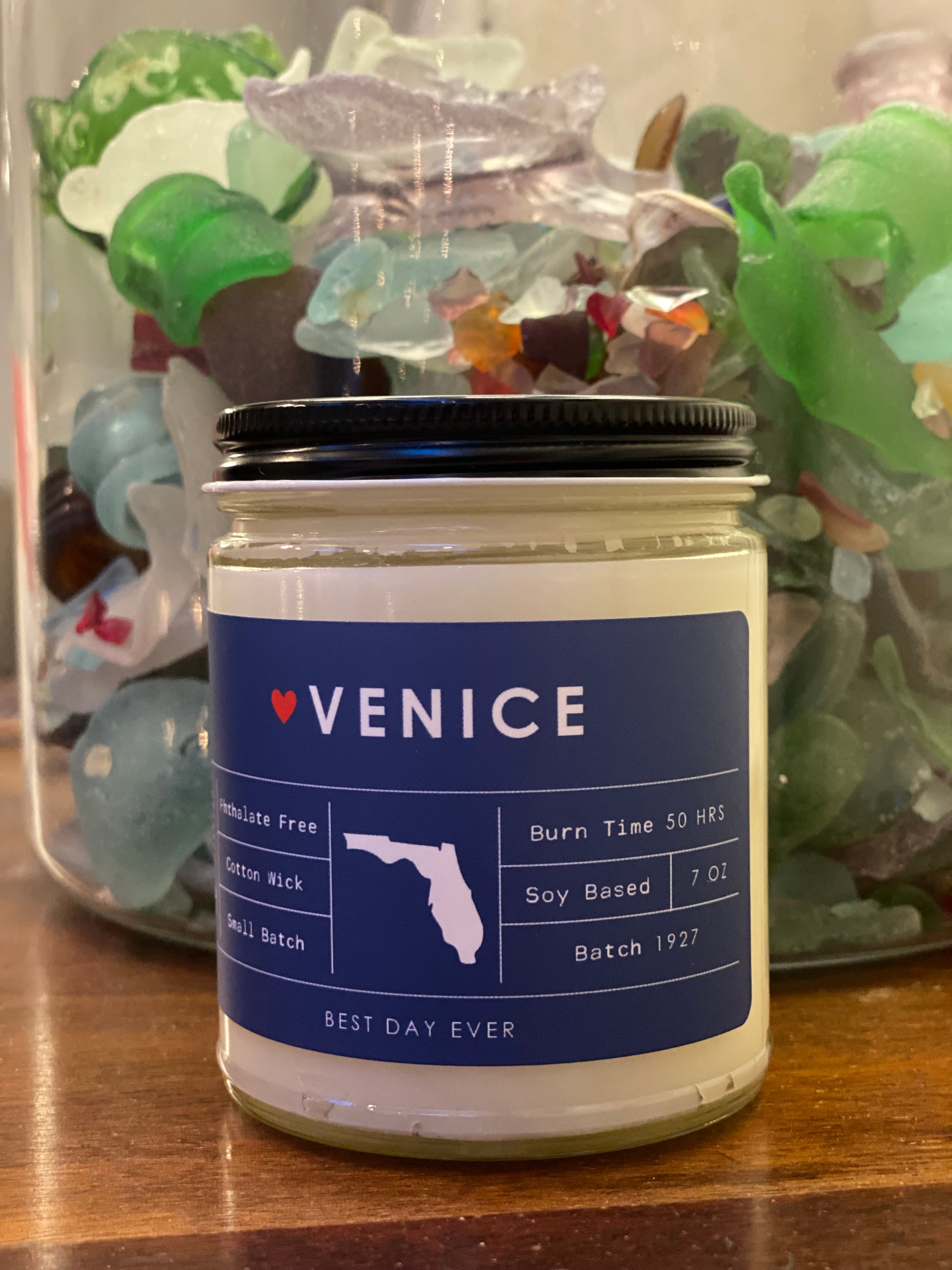 Venice, Florida Candle - Rambling Caravan candles are inspired by home, travel and adventure. Made from a soy/coconut based wax blend, the candles are hand poured in Virginia Beach, Virginia. We use phthalate free fragrances and have an assortment of fragrances from which to choose. Many of our candles have different color labels to choose from as well. We use cotton wicks with no zinc or lead. We do not use additives, nor scent enhancers or UV blockers. The burn time is approximately 50 hours.