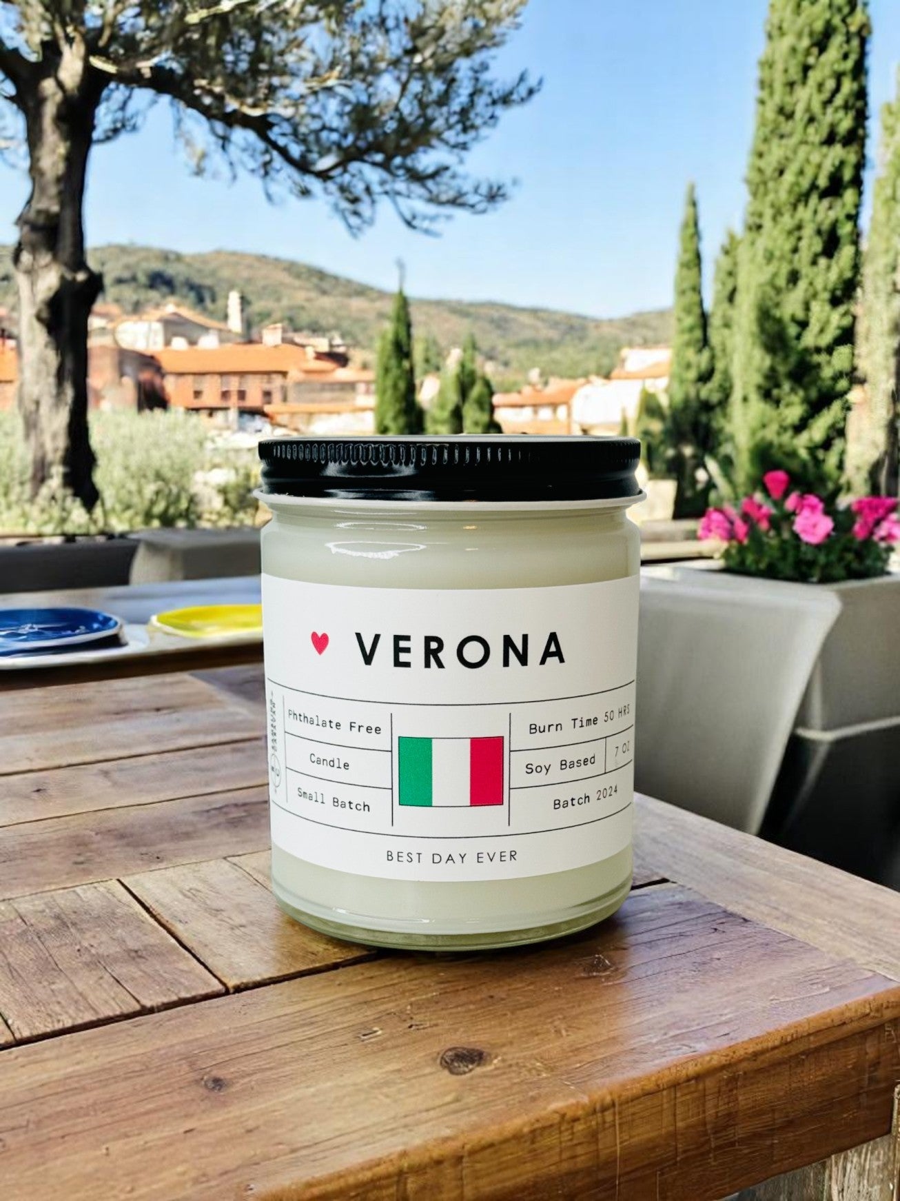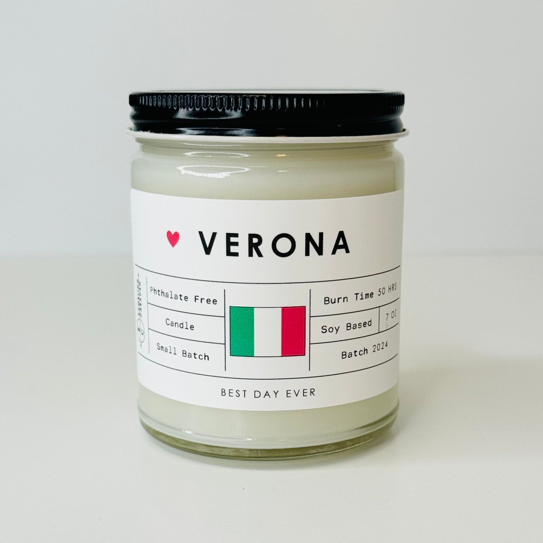 Verona, Italy Candle - Rambling Caravan candles are inspired by home, travel and adventure. Made from a soy/coconut based wax blend, the candles are hand poured in Virginia Beach, Virginia. We use phthalate free fragrances and have an assortment of fragrances from which to choose. Many of our candles have different color labels to choose from as well. We use cotton wicks with no zinc or lead. We do not use additives, nor scent enhancers or UV blockers. The burn time is approximately 50 hours.