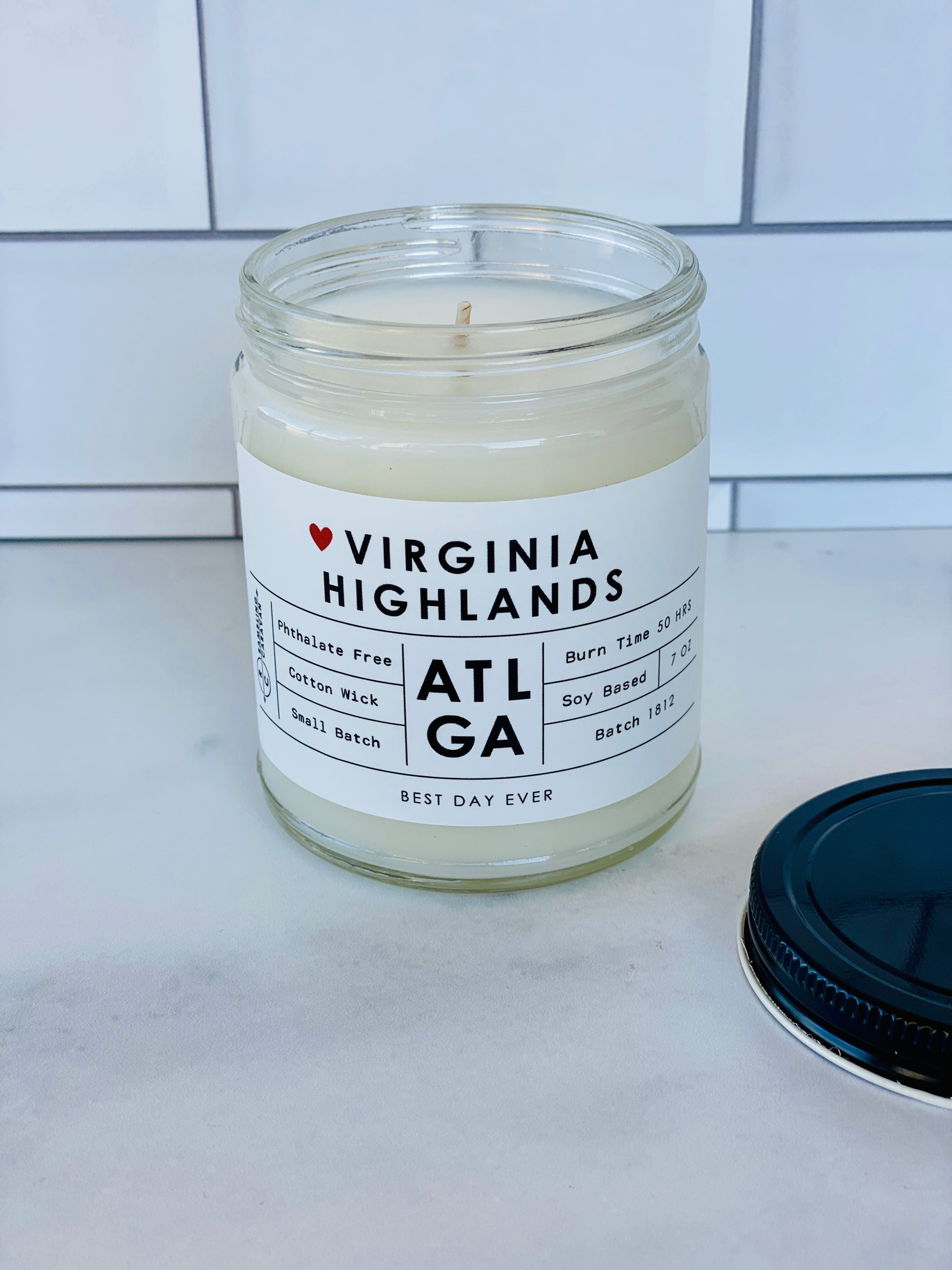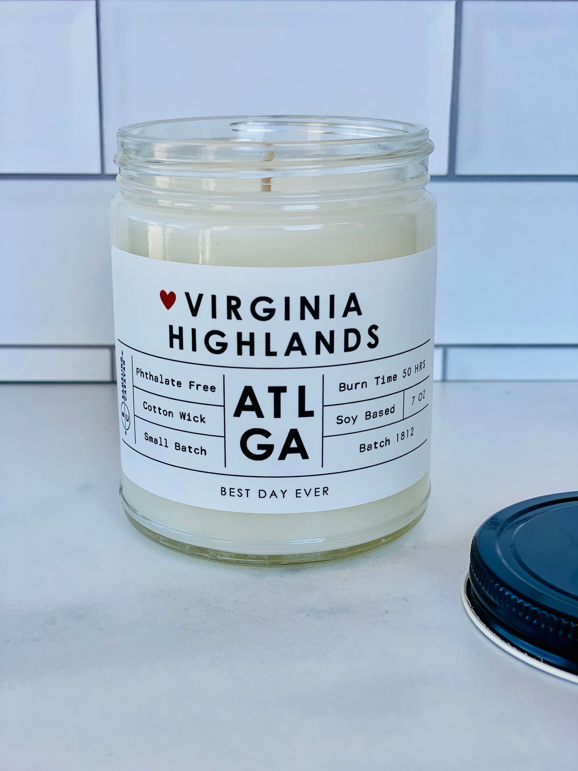 Virginia Highlands, Atlanta, Georgia Candle - Rambling Caravan candles are inspired by home, travel and adventure. Made from a soy/coconut based wax blend, the candles are hand poured in Virginia Beach, Virginia. We use phthalate free fragrances and have an assortment of fragrances from which to choose. Many of our candles have different color labels to choose from as well. We use cotton wicks with no zinc or lead. We do not use additives, nor scent enhancers or UV blockers. The burn time is approximately 50 hours.