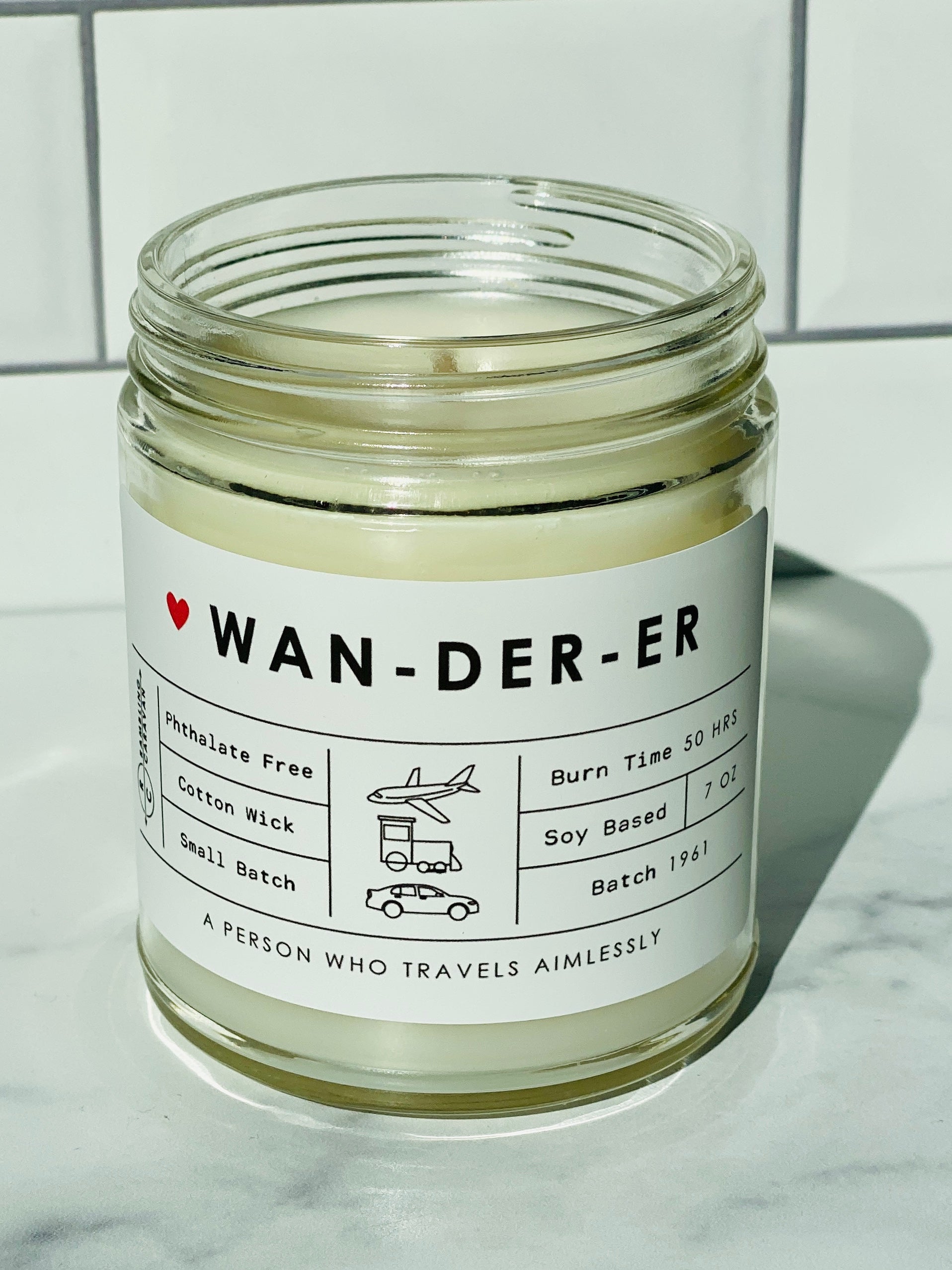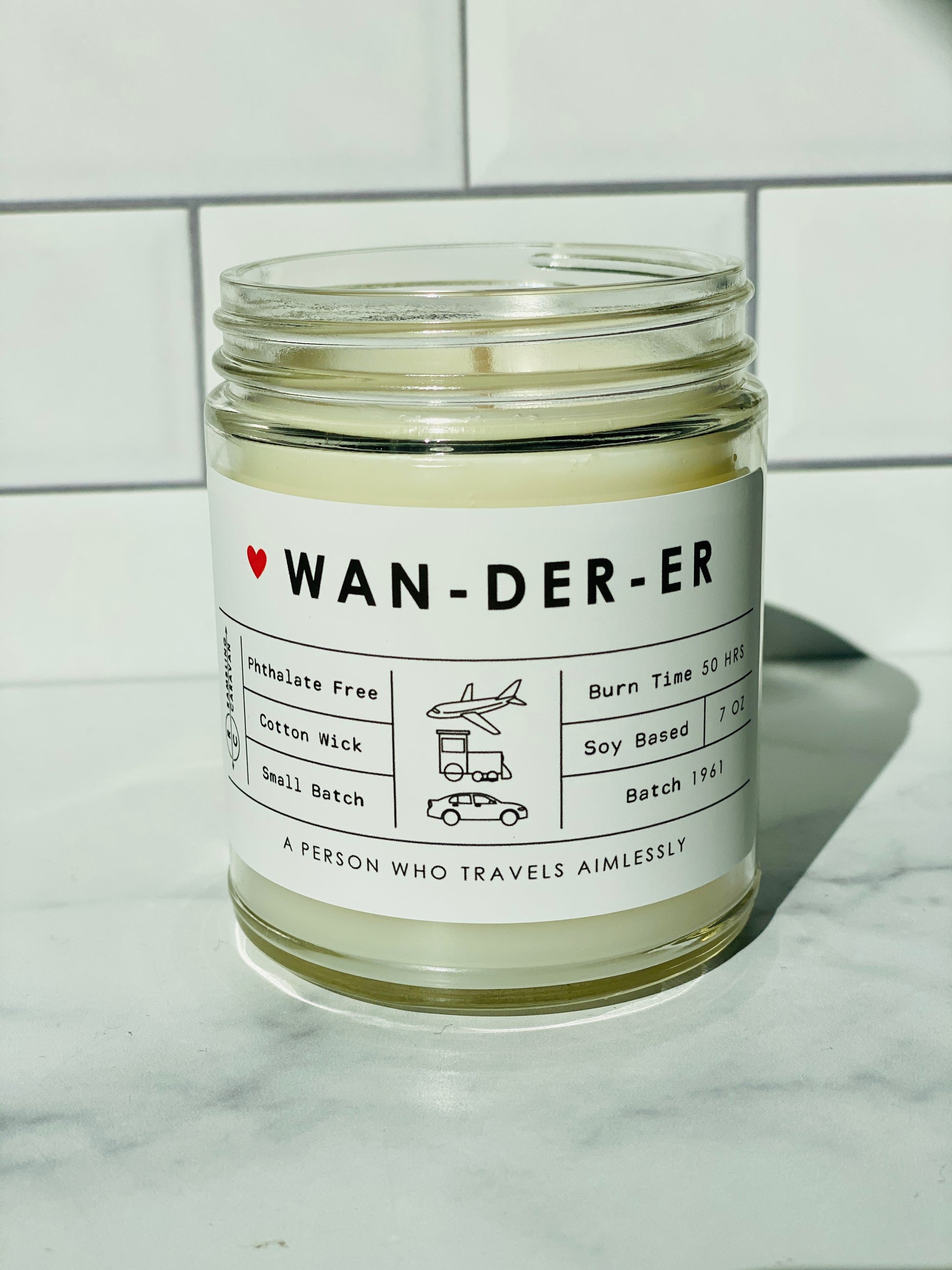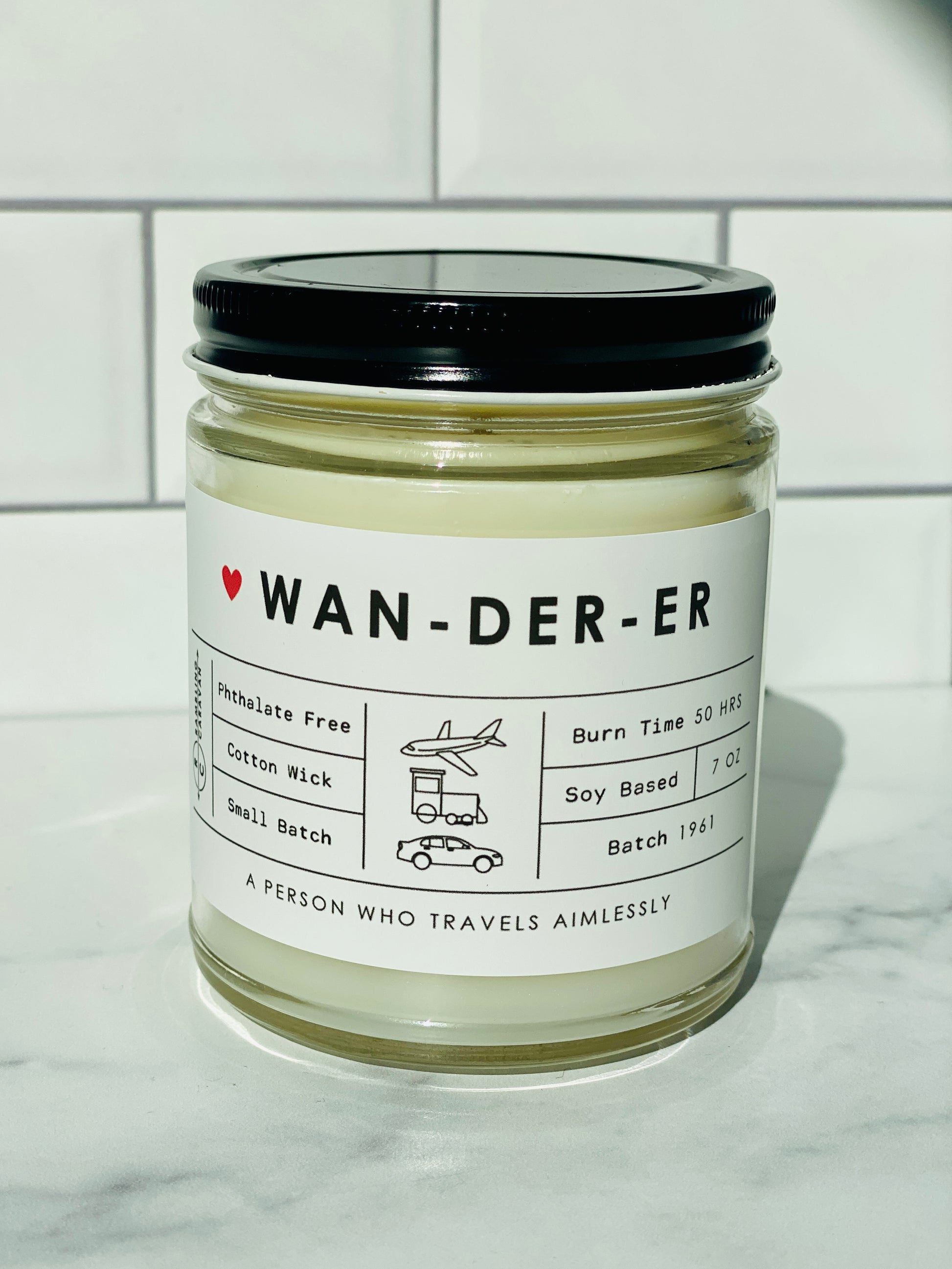 Wan-Der-Er Candle - Rambling Caravan candles are inspired by home, travel and adventure. Made from a soy/coconut based wax blend, the candles are hand poured in Virginia Beach, Virginia. We use phthalate free fragrances and have an assortment of fragrances from which to choose. Many of our candles have different color labels to choose from as well. We use cotton wicks with no zinc or lead. We do not use additives, nor scent enhancers or UV blockers. The burn time is approximately 50 hours.