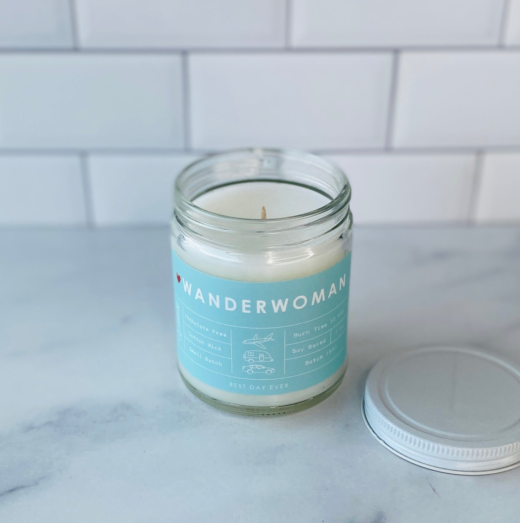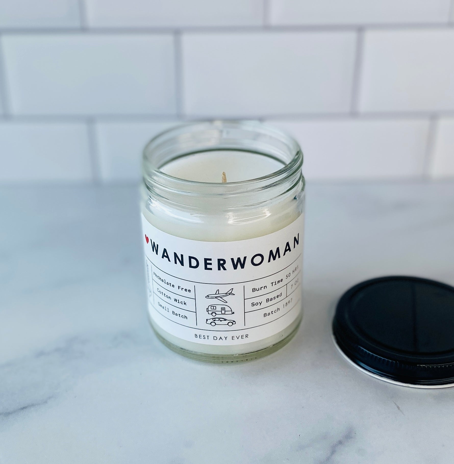 Wanderwoman Candle - Are you a Wanderwoman or a Wonderwoman? We know you are both! - Rambling Caravan candles are inspired by home, travel and adventure. Made from a soy/coconut based wax blend, the candles are hand poured in Virginia Beach, Virginia. We use phthalate free fragrances and have an assortment of fragrances from which to choose. Many of our candles have different color labels to choose from as well. We use cotton wicks with no zinc or lead. We do not use additives, nor scent enhancers or UV blockers. The burn time is approximately 50 hours.