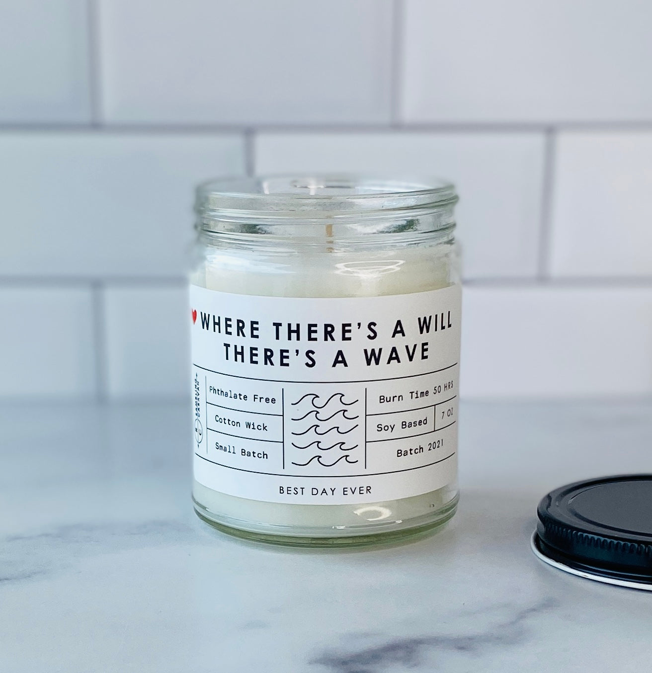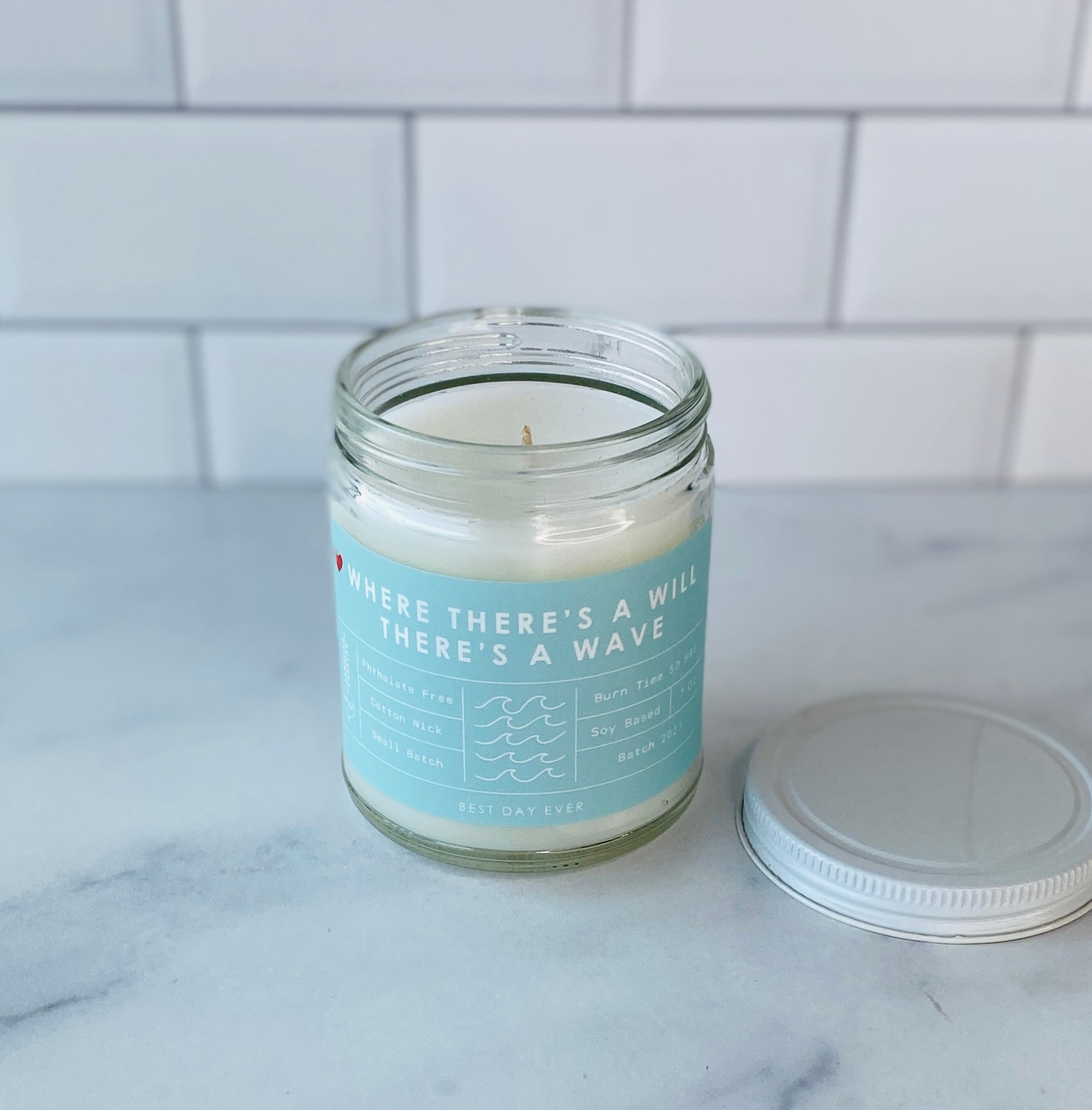 Where There's A Will There's A Wave Candle - Rambling Caravan candles are inspired by home, travel and adventure. Made from a soy/coconut based wax blend, the candles are hand poured in Virginia Beach, Virginia. We use phthalate free fragrances and have an assortment of fragrances from which to choose. Many of our candles have different color labels to choose from as well. We use cotton wicks with no zinc or lead. We do not use additives, nor scent enhancers or UV blockers. The burn time is approximately 50 hours.