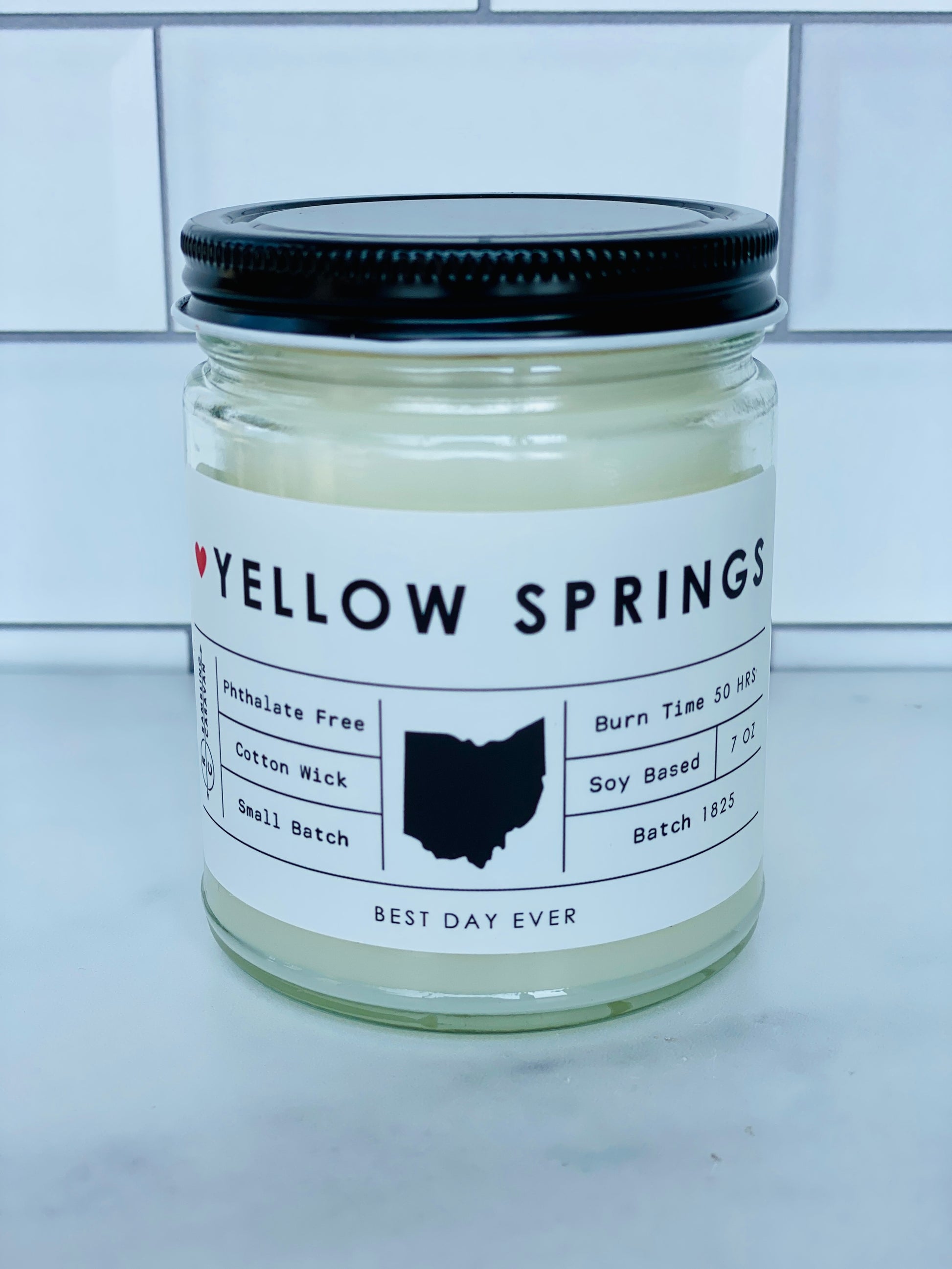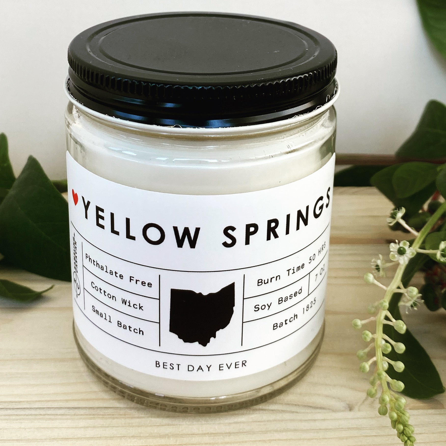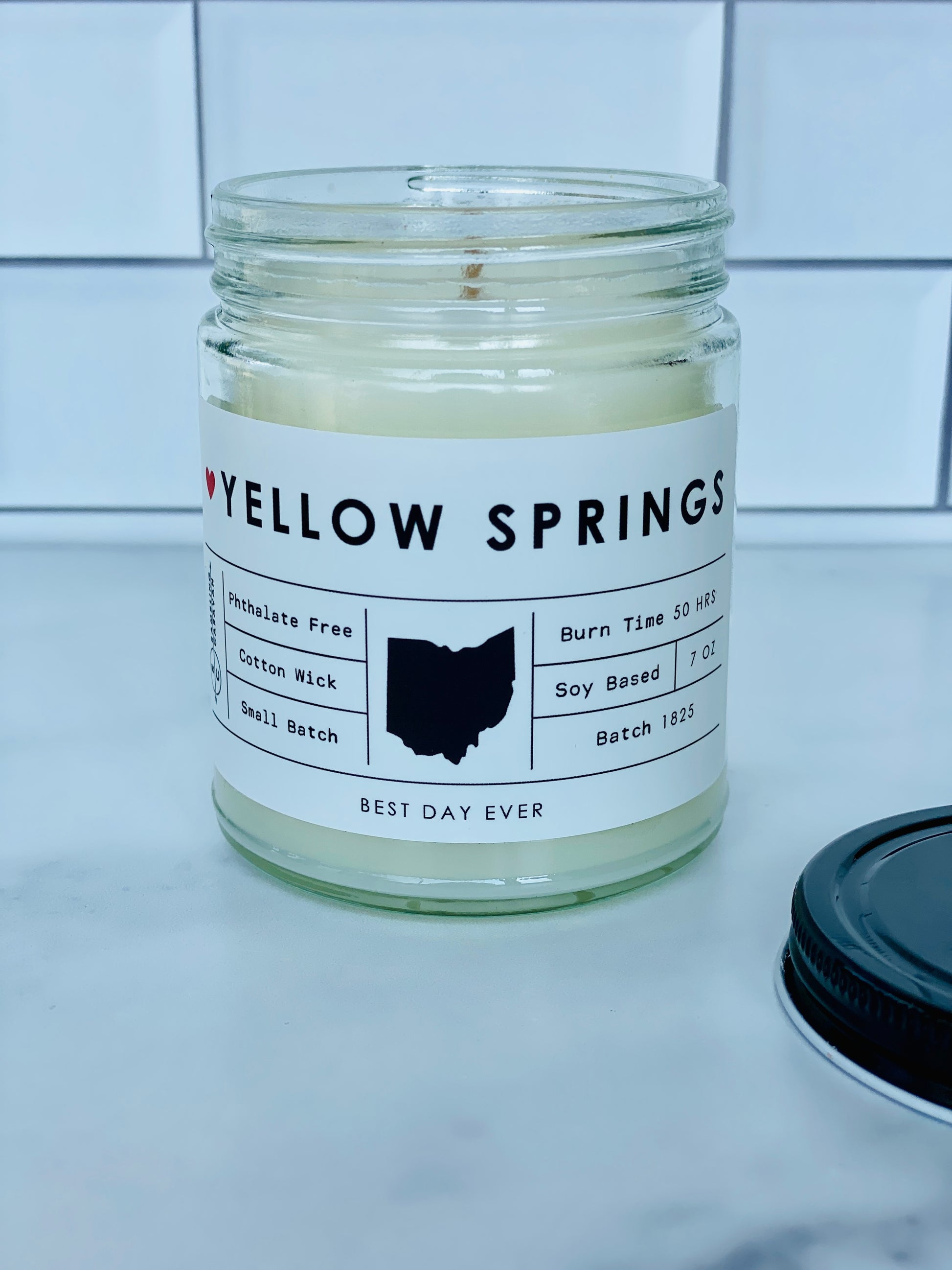 Yellow Springs, Ohio Candle - Rambling Caravan candles are inspired by home, travel and adventure. Made from a soy/coconut based wax blend, the candles are hand poured in Virginia Beach, Virginia. We use phthalate free fragrances and have an assortment of fragrances from which to choose. Many of our candles have different color labels to choose from as well. We use cotton wicks with no zinc or lead. We do not use additives, nor scent enhancers or UV blockers. The burn time is approximately 50 hours.